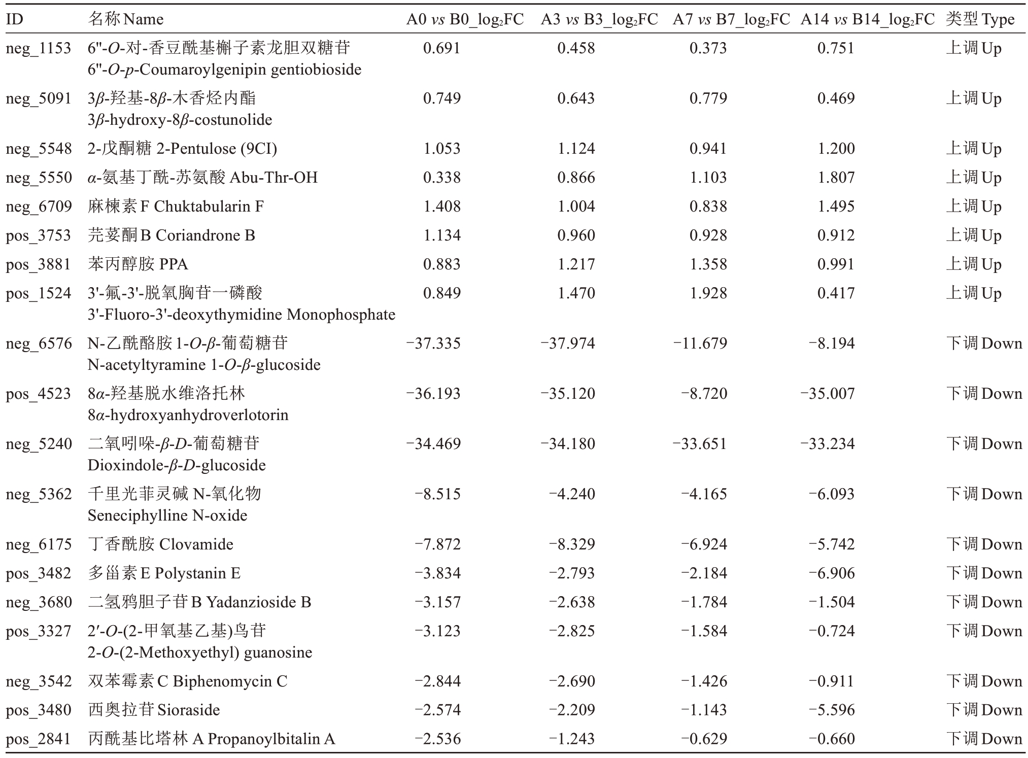 ID neg_1153 A0 vs B0_log2FC 0.691 A3 vs B3_log2FC 0.458 A7 vs B7_log2FC 0.373 A14 vs B14_log2FC 0.751类型Type上调Up neg_5091 0.749 0.643 0.779 0.469上调Up neg_5548 neg_5550 neg_6709 pos_3753 pos_3881 pos_1524 1.053 0.338 1.408 1.134 0.883 0.849 1.124 0.866 1.004 0.960 1.217 1.470 0.941 1.103 0.838 0.928 1.358 1.928 1.200 1.807 1.495 0.912 0.991 0.417上调Up上调Up上调Up上调Up上调Up上调Up neg_6576-37.335-37.974-11.679-8.194下调Down pos_4523-36.193-35.120-8.720-35.007下调Down neg_5240-34.469-34.180-33.651-33.234下调Down neg_5362-8.515-4.240-4.165-6.093下调Down neg_6175 pos_3482 neg_3680 pos_3327-7.872-3.834-3.157-3.123-8.329-2.793-2.638-2.825-6.924-2.184-1.784-1.584-5.742-6.906-1.504-0.724下调Down下调Down下调Down下调Down neg_3542 pos_3480 pos_2841名称Name 6''-O-对-香豆酰基槲子素龙胆双糖苷6''-O-p-Coumaroylgenipin gentiobioside 3β-羟基-8β-木香烃内酯3β-hydroxy-8β-costunolide 2-戊酮糖 2-Pentulose (9CI)α-氨基丁酰-苏氨酸 Abu-Thr-OH麻楝素F Chuktabularin F芫荽酮B Coriandrone B苯丙醇胺 PPA 3'-氟-3'-脱氧胸苷一磷酸3'-Fluoro-3'-deoxythymidine Monophosphate N-乙酰酪胺1-O-β-葡萄糖苷N-acetyltyramine 1-O-β-glucoside 8α-羟基脱水维洛托林8α-hydroxyanhydroverlotorin二氧吲哚-β-D-葡萄糖苷Dioxindole-β-D-glucoside千里光菲灵碱 N-氧化物Seneciphylline N-oxide丁香酰胺 Clovamide多甾素E Polystanin E二氢鸦胆子苷B Yadanzioside B 2′-O-(2-甲氧基乙基)鸟苷2-O-(2-Methoxyethyl) guanosine双苯霉素C Biphenomycin C西奥拉苷Sioraside丙酰基比塔林 A Propanoylbitalin A-2.844-2.574-2.536-2.690-2.209-1.243-1.426-1.143-0.629-0.911-5.596-0.660下调Down下调Down下调Down