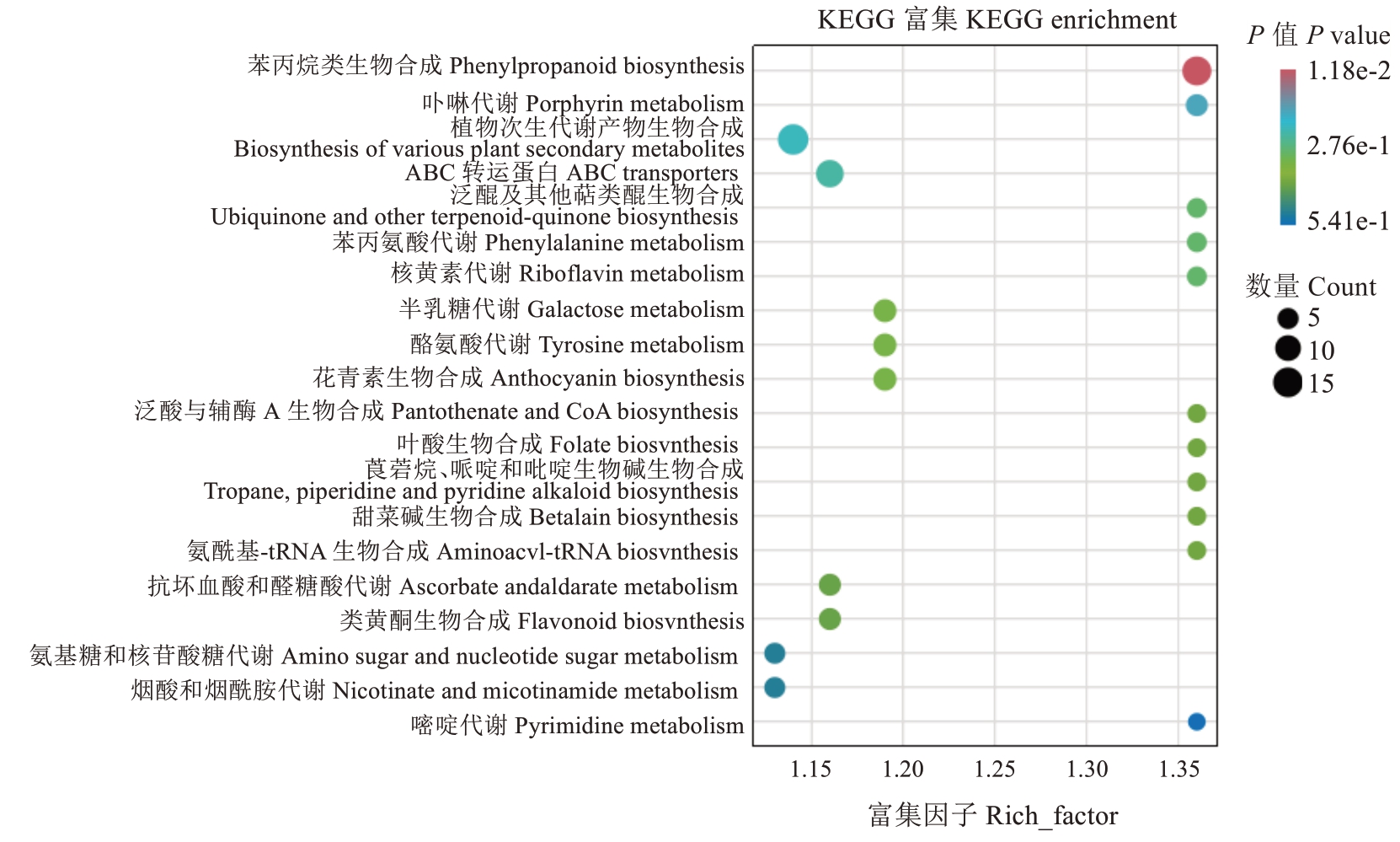 差异代谢物KEGG 通路分析表明(图5),抗感种质间差异代谢物富集于苯丙烷类生物合成(phenylpropanoid biosynthesis)、卟啉代谢(porphyrin metabolism)、植物次生代谢产物生物合成(biosynthesis of various plant secondary metabolites)、ABC 转运蛋白(ABC transporters)、泛醌及其他萜类醌生物合成(ubiquinone and other terpenoid-quinone biosynthesis)、苯丙氨酸代谢(phenylalanine metabolism)、核黄素代谢(riboflavin metabolism)、半乳糖代谢(galactose metabolism)、酪氨酸代谢(tyrosime metabolism)、花青素生物合成(anthocyanin biosynthesis)等代谢通路,其中在苯丙烷类生物合成通路显著富集。进一步分析发现193 个共有差异代谢物显著富集于苯丙氨酸代谢(phenylalanine metabolism)、丁酸代谢(butanoate metabolism)、卟啉代谢(porphyrin metabolism)、苯丙烷类生物合成(phenylpropanoid biosynthesis)通路。