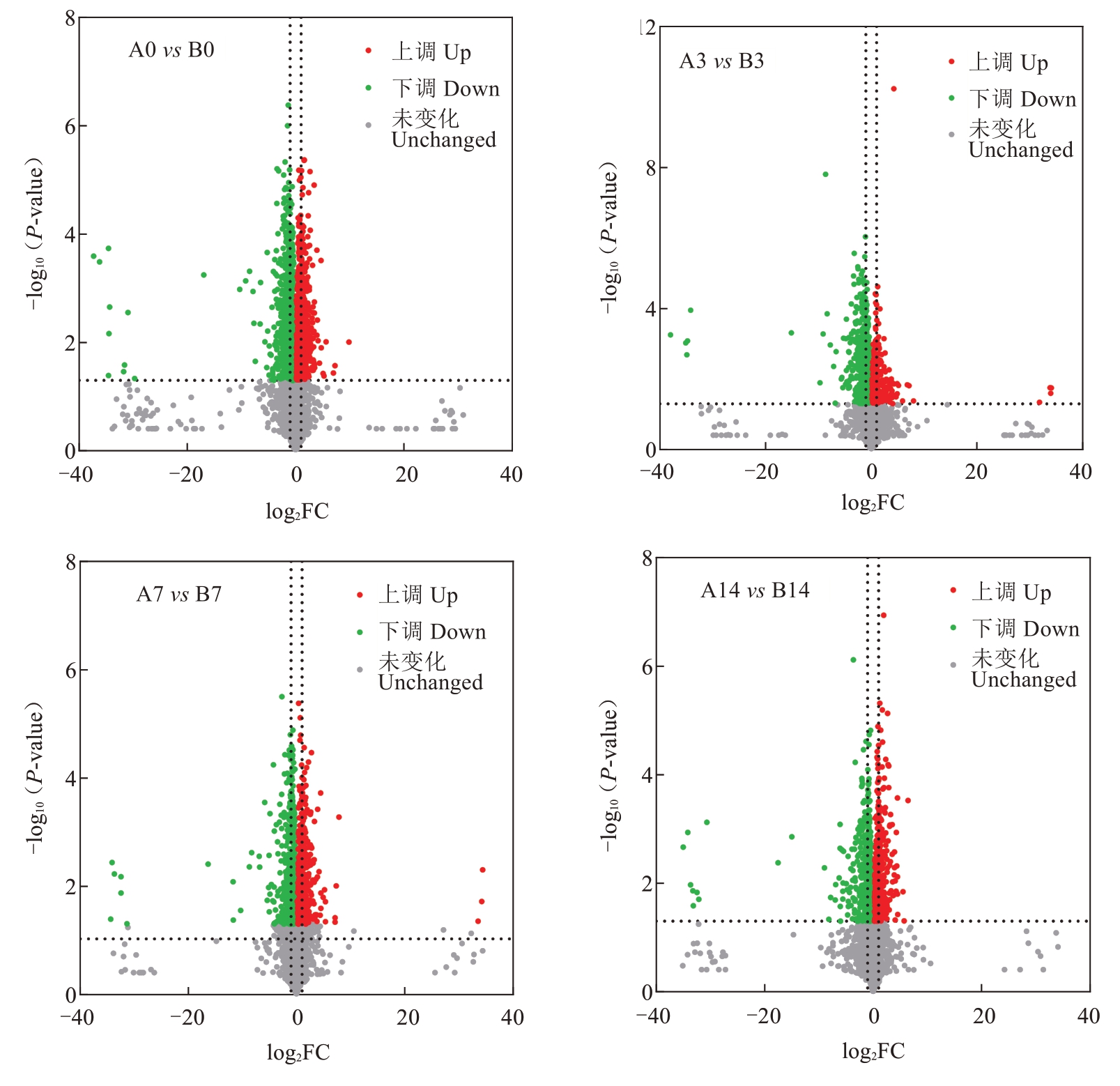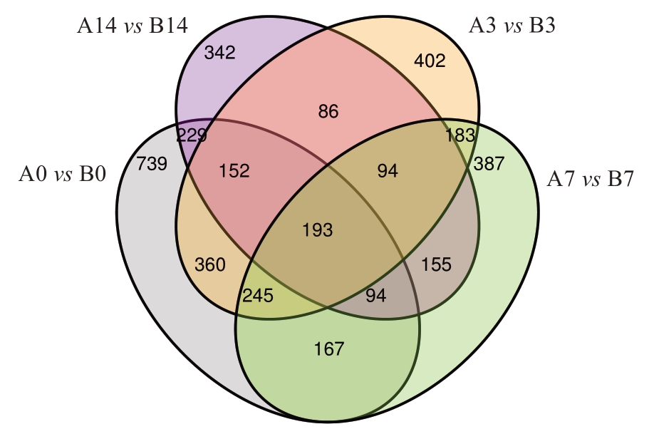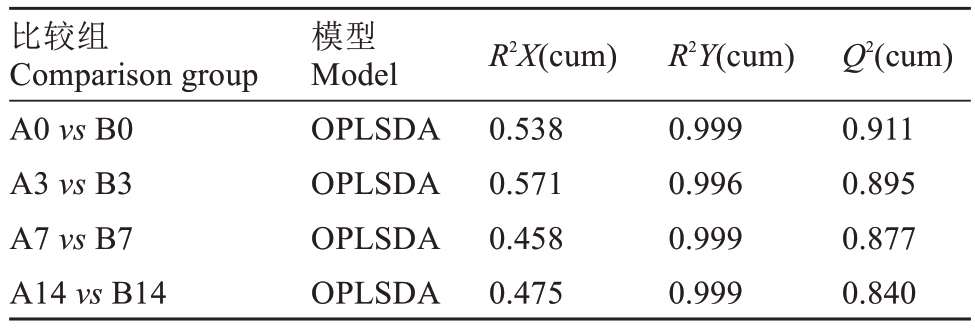 比较组Comparison group A0 vs B0 A3 vs B3 A7 vs B7 A14 vs B14模型Model OPLSDA OPLSDA OPLSDA OPLSDA R2X(cum)0.538 0.571 0.458 0.475 R2Y(cum)0.999 0.996 0.999 0.999 Q2(cum)0.911 0.895 0.877 0.840