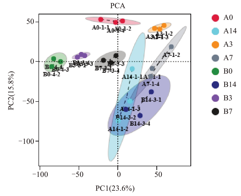 PCA 主成分分析是一种无监督模式识别的多维数据统计分析方法,反映代谢组数据的原始情况。PCA 分析结果以散点图形式展示各代谢组之间的分离趋势,以此表明各样品组间代谢物的差异。本研究PCA 结果如图2 所示,2 个主成分的累计贡献率达39.4%,当PC1=23.6%、PC2=15.8%时,8组样品间的分离趋势较为明显,反映出样品间代谢组数据存在差异,且重复样本聚在一起,表明重复样本间的相似性较高,可用于后续分析。进一步分析发现,除B14 组外,抗病组和感病组样本分离明显,表明抗病种质和感病种质的代谢群存在显著差异,与预期结果一致。此外,未接种抗病种质样本A0大部分分布在PC1 左半部分,接种后抗病种质A 组样本均分布在PC1 右半部分;与未接种感病种质样本B0 相比,接种后感病种质B 组样本在PC1 上向右发生偏移。由此表明,在溃疡病病原菌侵染下,猕猴桃抗感种质中的代谢物均发生了变化。