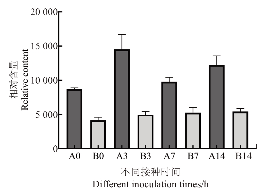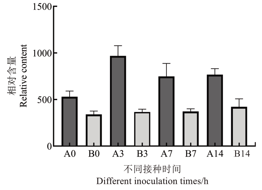 抗感种质间pestalactam B 的含量变化如图8 所示,抗病种质中pestalactam B 含量始终高于感病种质。接种前,抗病种质中pestalactam B 含量是感病种质的1.56 倍;在接种第3 天时,抗病种质中pestalactam B 是感病种质的2.65 倍,抗感种质间含量差异达到最大;在第7 天时,抗病种质中pestalactam B含量是感病种质的2.01 倍;在第14 天时,抗病种质中pestalactam B含量是感病种质的1.82倍。针对抗病种质,接种第3 天时pestalactam B 含量最高,是接种前的1.83 倍;而针对感病种质,pestalactam B 含量逐渐升高,在接种第14 天时达到最高,是接种前的1.23倍。