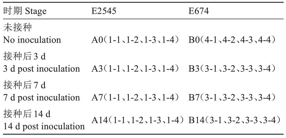 时期 Stage未接种No inoculation接种后3 d 3 d post inoculation接种后7 d 7 d post inoculation接种后14 d 14 d post inoculation E2545 E674 A0(1-1、1-2、1-3、1-4)B0(4-1、4-2、4-3、4-4)A3(1-1、1-2、1-3、1-4)B3(3-1、3-2、3-3、3-4)A7(1-1、1-2、1-3、1-4)A14(1-1、1-2、1-3、1-4)B7(3-1、3-2、3-3、3-4)B14(3-1、3-2、3-3、3-4)