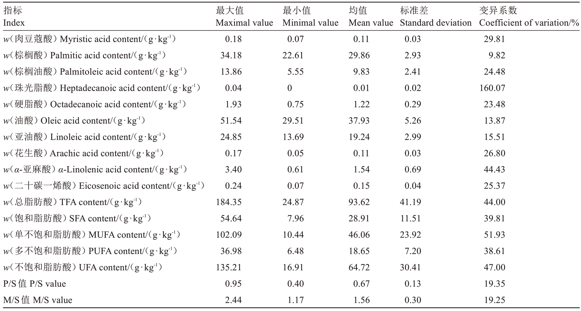 指标Index w(肉豆蔻酸) Myristic acid content/(g·kg-1)w(棕榈酸) Palmitic acid content/(g·kg-1)w(棕榈油酸) Palmitoleic acid content/(g·kg-1)w(珠光脂酸) Heptadecanoic acid content/(g·kg-1)w(硬脂酸) Octadecanoic acid content/(g·kg-1)w(油酸) Oleic acid content/(g·kg-1)w(亚油酸) Linoleic acid content/(g·kg-1)w(花生酸) Arachic acid content/(g·kg-1)w(α-亚麻酸) α-Linolenic acid content/(g·kg-1)w(二十碳一烯酸) Eicosenoic acid content/(g·kg-1)w(总脂肪酸) TFA content/(g·kg-1)w(饱和脂肪酸) SFA content/(g·kg-1)w(单不饱和脂肪酸) MUFA content/(g·kg-1)w(多不饱和脂肪酸) PUFA content/(g·kg-1)w(不饱和脂肪酸) UFA content/(g·kg-1)P/S值 P/S value M/S值 M/S value最大值Maximal value 0.18 34.18 13.86 0.04 1.93 51.54 24.85 0.17 3.40 0.24 184.35 54.64 102.09 36.98 135.21 0.95 2.44最小值Minimal value 0.07 22.61 5.55 0 0.75 29.51 13.69 0.05 0.61 0.07 24.87 7.96 10.44 6.48 16.91 0.40 1.17均值Mean value 0.11 29.86 9.83 0.01 1.22 37.93 19.24 0.11 1.54 0.15 93.62 28.91 46.06 18.65 64.72 0.67 1.56标准差Standard deviation 0.03 2.93 2.41 0.02 0.29 5.26 2.99 0.03 0.69 0.04 41.19 11.51 23.92 7.20 30.41 0.13 0.30变异系数Coefficient of variation/%29.81 9.82 24.48 160.07 23.48 13.87 15.51 26.80 44.43 25.37 44.00 39.81 51.93 38.61 47.00 19.35 19.25