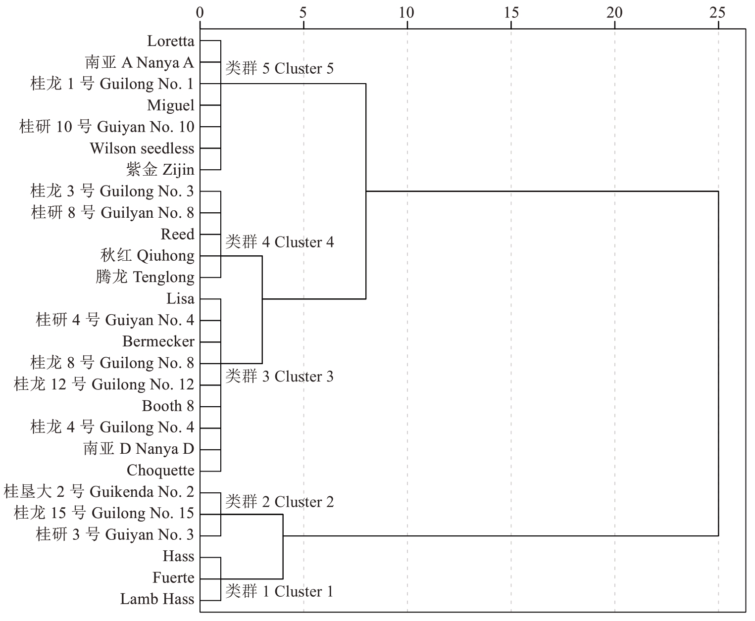 2.2.3 聚类分析 基于27 个油梨品种的13 项果实品质指标进行聚类分析,聚类方法采用Ward 法,聚类区间为平方欧氏距离,结果见图6。在欧式距离3.0 处可以将27 个油梨品种分为5 个类群。类群1聚集了Hass、Fuerte 和Lamb Hass;类群2 聚集了桂垦大2 号、桂龙15 号和桂研3 号;类群3 聚集了9 个品种,包括Lisa、桂研4号、Bernecker、桂龙8号、桂龙12号、Booth 8、桂龙4号、南亚D 和Choquette;类群4聚集了桂龙3 号、桂研8 号、Reed、秋红和腾龙;类群5 聚集了Loretta、南亚A、桂龙1 号、Miguel、桂研10号、Wilson seedless 和紫金。其中,类群1 的脂肪酸含量和干物质含量最高,其余品质指标也较优,果实综合品质表现优良。