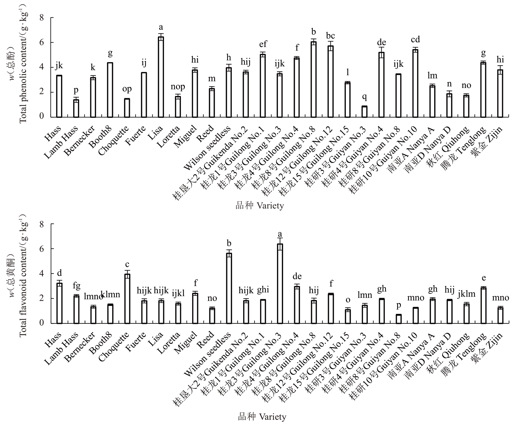 Fig. 3 Comparison of contents of total phenol and total flavonoid in pulp of different avocado varieties
