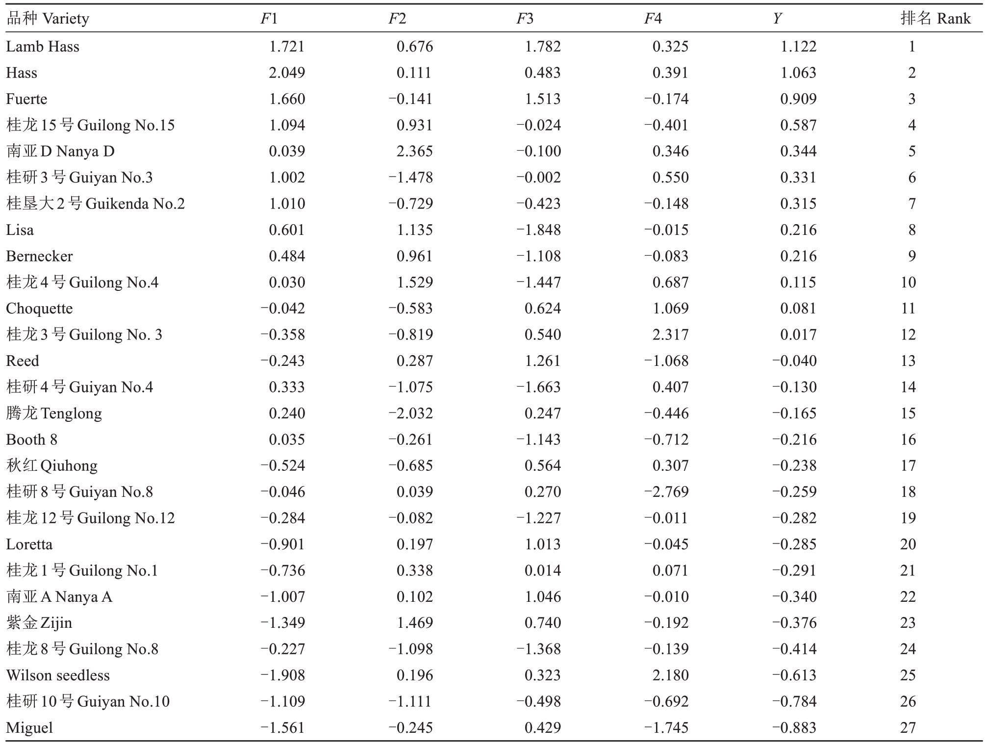 根据4 个主成分的载荷矩阵计算出每个主成分的得分,再以每个主成分的贡献率为权重对主成分得分进行加和,求得主成分综合得分Y(表5)。综合得分反映各品种品质的优劣,对Y值进行降序排列,排名前3的品种依次为Lamb Hass、Hass和Fuerte。