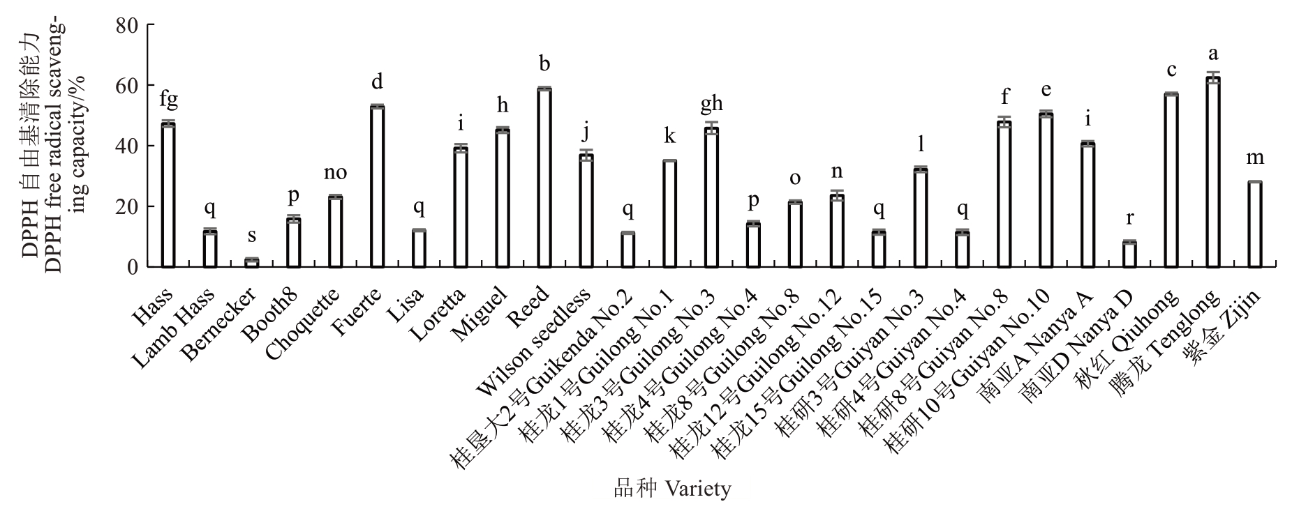 图4 不同油梨品种果肉DPPH 和ABTS 自由基清除能力比较