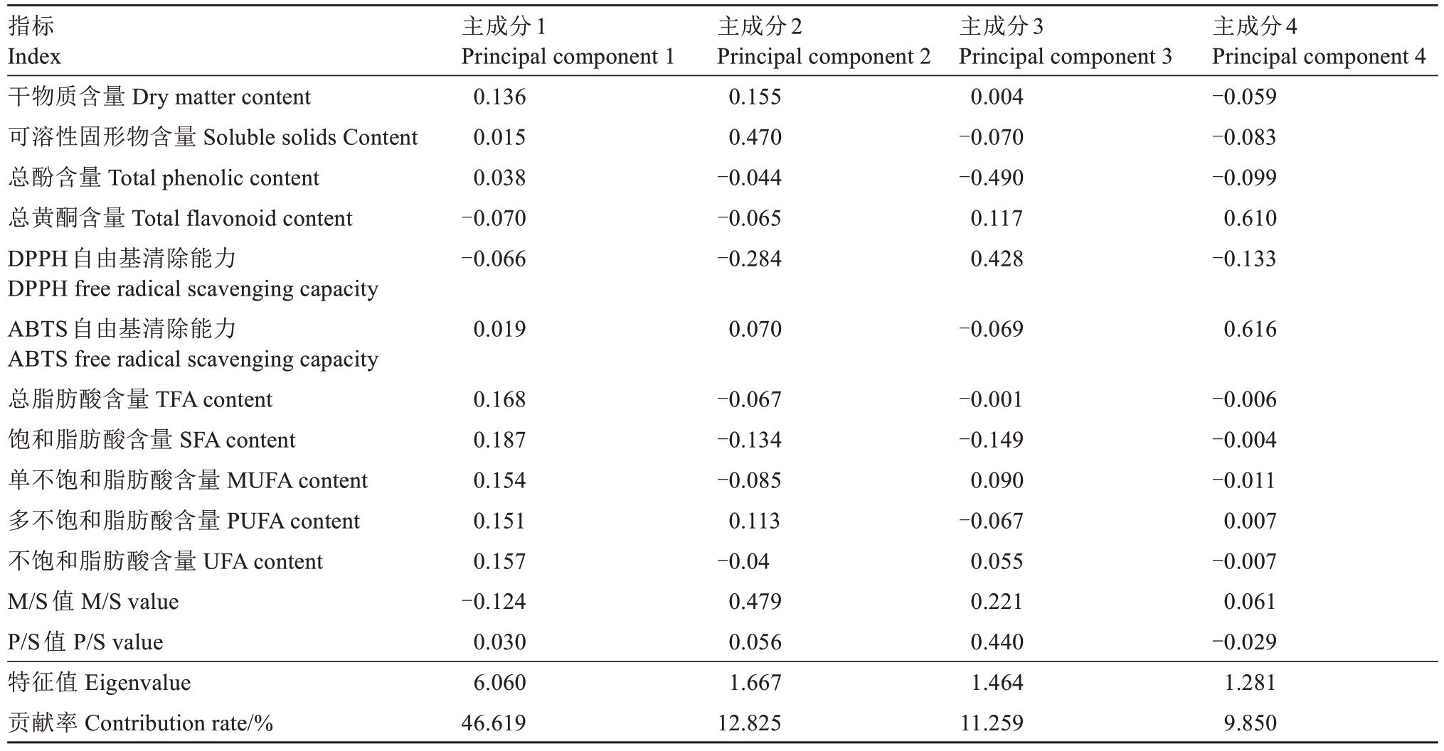 指标Index干物质含量 Dry matter content可溶性固形物含量 Soluble solids Content总酚含量 Total phenolic content总黄酮含量 Total flavonoid content DPPH自由基清除能力DPPH free radical scavenging capacity ABTS自由基清除能力ABTS free radical scavenging capacity总脂肪酸含量 TFA content饱和脂肪酸含量 SFA content单不饱和脂肪酸含量 MUFA content多不饱和脂肪酸含量 PUFA content不饱和脂肪酸含量 UFA content M/S值 M/S value P/S值 P/S value特征值 Eigenvalue贡献率 Contribution rate/%主成分1 Principal component 1 0.136 0.015 0.038-0.070-0.066主成分2 Principal component 2 0.155 0.470-0.044-0.065-0.284主成分3 Principal component 3 0.004-0.070-0.490 0.117 0.428主成分4 Principal component 4-0.059-0.083-0.099 0.610-0.133 0.019 0.070-0.069 0.616 0.168 0.187 0.154 0.151 0.157-0.124 0.030 6.060 46.619-0.067-0.134-0.085 0.113-0.04 0.479 0.056 1.667 12.825-0.001-0.149 0.090-0.067 0.055 0.221 0.440 1.464 11.259-0.006-0.004-0.011 0.007-0.007 0.061-0.029 1.281 9.850