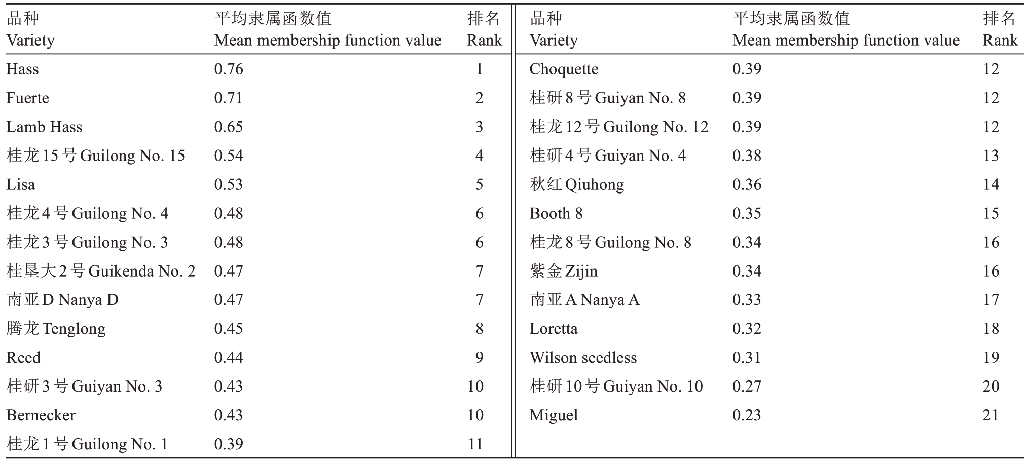 品种Variety Hass Fuerte Lamb Hass桂龙15号Guilong No. 15 Lisa桂龙4号Guilong No. 4桂龙3号Guilong No. 3桂垦大2号Guikenda No. 2南亚D Nanya D腾龙Tenglong Reed桂研3号Guiyan No. 3 Bernecker桂龙1号Guilong No. 1平均隶属函数值Mean membership function value 0.76 0.71 0.65 0.54 0.53 0.48 0.48 0.47 0.47 0.45 0.44 0.43 0.43 0.39排名Rank 1 2 3 4 5 6 6 7 7 8 9 10 10 11品种Variety Choquette桂研8号Guiyan No. 8桂龙12号Guilong No. 12桂研4号Guiyan No. 4秋红Qiuhong Booth 8桂龙8号Guilong No. 8紫金Zijin南亚A Nanya A Loretta Wilson seedless桂研10号Guiyan No. 10 Miguel平均隶属函数值Mean membership function value 0.39 0.39 0.39 0.38 0.36 0.35 0.34 0.34 0.33 0.32 0.31 0.27 0.23排名Rank 12 12 12 13 14 15 16 16 17 18 19 20 21