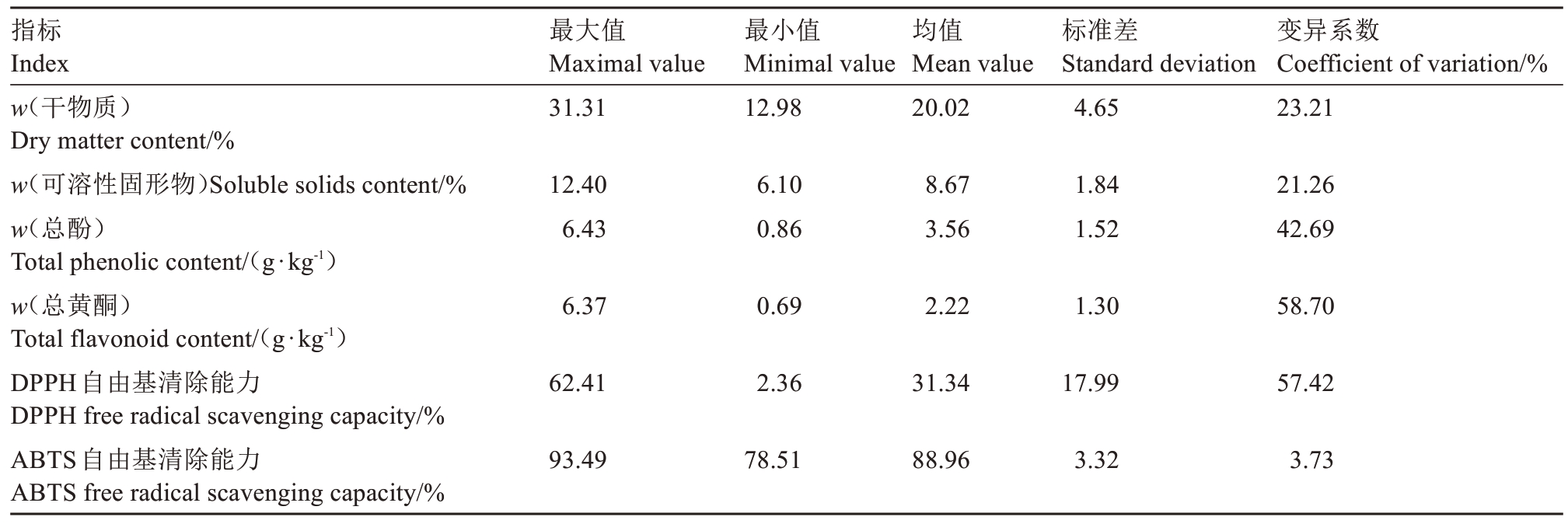 指标Index w(干物质)Dry matter content/%w(可溶性固形物)Soluble solids content/%w(总酚)Total phenolic content/(g·kg-1)w(总黄酮)Total flavonoid content/(g·kg-1)DPPH自由基清除能力DPPH free radical scavenging capacity/%ABTS自由基清除能力ABTS free radical scavenging capacity/%最大值Maximal value 31.31最小值Minimal value 12.98均值Mean value 20.02标准差Standard deviation 4.65变异系数Coefficient of variation/%23.21 12.40 6.43 6.10 0.86 8.67 3.56 1.84 1.52 21.26 42.69 6.37 0.69 2.22 1.30 58.70 62.41 2.36 31.34 17.99 57.42 93.49 78.51 88.96 3.32 3.73