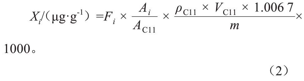 式中Xi为试样中脂肪酸甲酯i含量;Fi为脂肪酸甲酯i 的响应因子;Ai为试样中脂肪酸甲酯i 的峰面积;AC11为试样中加入的内标物十一碳酸甲酯峰面积;ρC11为十一碳酸甘油三酯浓度(mg·mL-1);VC11为试样中加入十一碳酸甘油三酯体积(mL);1.006 7为十一碳酸甘油三酯转化成十一碳酸甲酯的转换系数;m为试样的质量(g)。