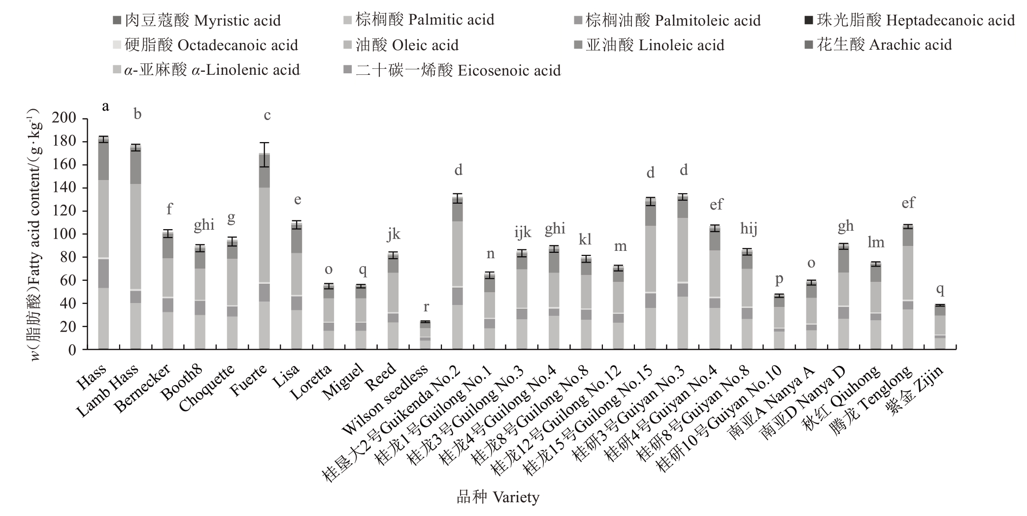2.1.3 脂肪酸组成及含量比较分析 由图5 可知,油梨的脂肪酸由肉豆蔻酸、棕榈酸、棕榈油酸、珠光脂酸、硬脂酸、油酸、亚油酸、花生酸、α-亚麻酸和二十碳一烯酸组成。其中珠光脂酸仅在8 个品种(Booth8、Choquette、Fuerte、Lisa、桂垦大2 号、桂龙3号、桂龙4 号和桂龙8 号)中检测出。由表2 可以看出,油梨果实的脂肪酸各组分平均含量由高到低的顺序为油酸(37.93 g·kg-1)>棕榈酸(29.86 g·kg-1)>亚油酸(19.24 g·kg-1)>棕榈油酸(9.83 g·kg-1)>α-亚麻酸(1.54 g·kg-1)>硬脂酸(1.22 g·kg-1)>二十碳一烯酸(0.15 g·kg-1)>花生酸(0.11 g·kg-1)=肉豆蔻酸(0.11 g·kg-1)>珠光脂酸(0.01 g·kg-1)。脂肪酸各组分的变异系数范围为9.82%~160.07%,其中,珠光脂酸的变异系数最高,其次是α-亚麻酸。