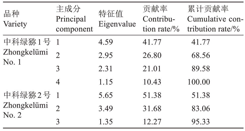 品种Variety中科绿猕1号Zhongkelümi No. 1主成分Principal component 1 2 3 4 1 2 3特征值Eigenvalue 4.59 2.95 2.31 1.15 5.65 3.49 1.35贡献率Contribution rate/%41.77 26.80 21.01 10.43 51.38 31.68 12.27累计贡献率Cumulative contribution rate/%41.77 68.56 89.58 100.00中科绿猕2号Zhongkelümi No. 2 51.38 83.06 95.33