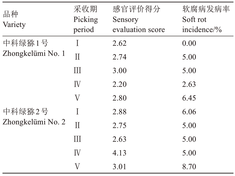 表2 不同采收期对猕猴桃感官评价和软腐病发病率的影响