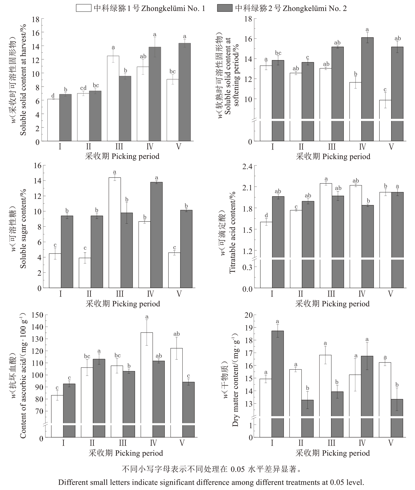 中科绿猕2 号刚采摘时处于采收期Ⅴ时可溶性固形物含量最高,达14.37%,与采收期Ⅳ无显著差异,较采收期Ⅰ、Ⅱ、Ⅲ分别显著提高109.22%、95.02%、50.7%;软熟后则在采收期Ⅳ时含量最高,达16.10%,与采收期Ⅲ、Ⅴ无显著差异;在采收期Ⅳ时可溶性糖含量最高,为13.79%,且显著高于其他采收期,其他采收期之间无显著差异;在采收期Ⅴ时可滴定酸含量最高,为2.02%,显著高于采收期Ⅳ,与其他采收期则无显著差异;在采收期Ⅱ时抗坏血酸含量最高,为113.13 mg·100 g-1,显著高于采收期Ⅰ、Ⅲ、Ⅴ;在采收期Ⅰ时干物质含量最高,为18.72%,与采收期Ⅳ无显著差异,但显著高于其他处理。