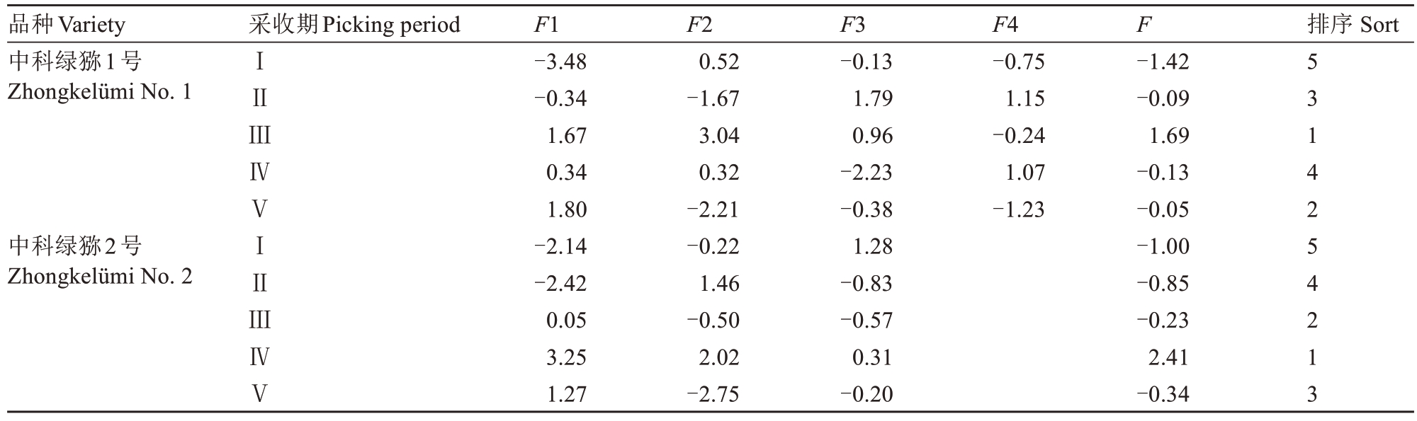 由表4 可知,F 值为综合主成分值,中科绿猕1号在采收期Ⅲ时的综合主成分值最高,为1.69,其次为采收期Ⅴ,F 值为-0.05,采收期Ⅰ的F 值最低,为-1.42,综合评价表现最差;中科绿猕2号在采收期Ⅳ时的综合主成分值最高,为2.41;其次为采收期Ⅲ,F 值为-0.23;采收期Ⅰ的F 值最低,为-1,综合评价表现最差。因此,中科绿猕1 号宜在采收期Ⅲ时(即花后166 d)采收,中科绿猕2 号宜在采收期Ⅳ时(即花后174 d)采收,此时采收对猕猴桃的生长发育、品质提高效果最佳,同时发病率较低,能保证最大收益。