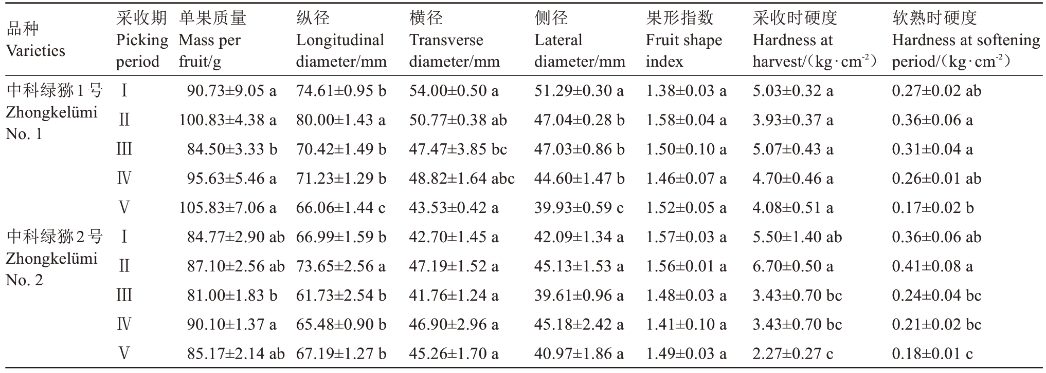 品种Varieties中科绿猕1号Zhongkelümi No. 1采收期Picking period中科绿猕2号Zhongkelümi No. 2ⅠⅡⅢⅣⅤⅠⅡⅢⅣⅤ单果质量Mass per fruit/g 90.73±9.05 a 100.83±4.38 a 84.50±3.33 b 95.63±5.46 a 105.83±7.06 a 84.77±2.90 ab 87.10±2.56 ab 81.00±1.83 b 90.10±1.37 a 85.17±2.14 ab纵径Longitudinal diameter/mm 74.61±0.95 b 80.00±1.43 a 70.42±1.49 b 71.23±1.29 b 66.06±1.44 c 66.99±1.59 b 73.65±2.56 a 61.73±2.54 b 65.48±0.90 b 67.19±1.27 b横径Transverse diameter/mm 54.00±0.50 a 50.77±0.38 ab 47.47±3.85 bc 48.82±1.64 abc 43.53±0.42 a 42.70±1.45 a 47.19±1.52 a 41.76±1.24 a 46.90±2.96 a 45.26±1.70 a侧径Lateral diameter/mm 51.29±0.30 a 47.04±0.28 b 47.03±0.86 b 44.60±1.47 b 39.93±0.59 c 42.09±1.34 a 45.13±1.53 a 39.61±0.96 a 45.18±2.42 a 40.97±1.86 a果形指数Fruit shape index 1.38±0.03 a 1.58±0.04 a 1.50±0.10 a 1.46±0.07 a 1.52±0.05 a 1.57±0.03 a 1.56±0.01 a 1.48±0.03 a 1.41±0.10 a 1.49±0.03 a采收时硬度Hardness at harvest/(kg·cm-2)5.03±0.32 a 3.93±0.37 a 5.07±0.43 a 4.70±0.46 a 4.08±0.51 a 5.50±1.40 ab 6.70±0.50 a 3.43±0.70 bc 3.43±0.70 bc 2.27±0.27 c软熟时硬度Hardness at softening period/(kg·cm-2)0.27±0.02 ab 0.36±0.06 a 0.31±0.04 a 0.26±0.01 ab 0.17±0.02 b 0.36±0.06 ab 0.41±0.08 a 0.24±0.04 bc 0.21±0.02 bc 0.18±0.01 c
