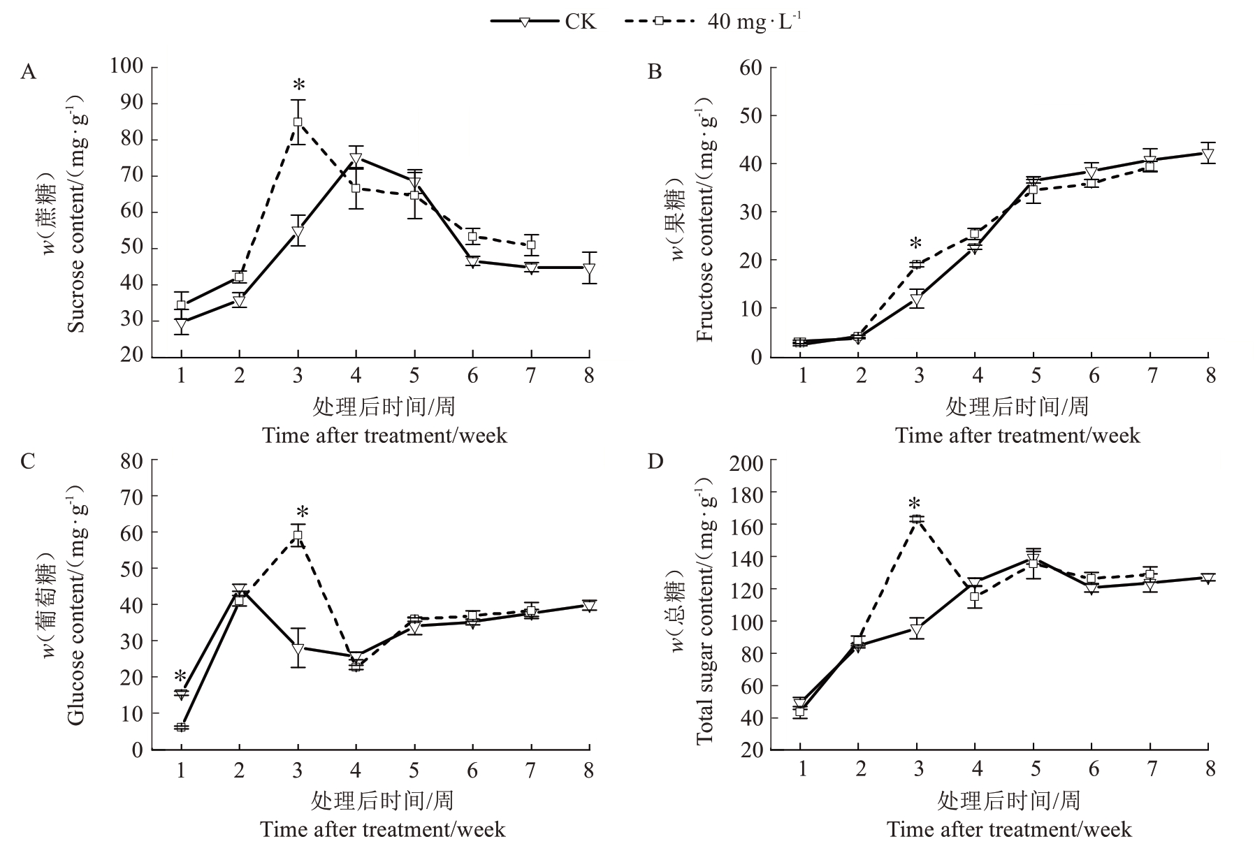 如图9-C 所示,SS 活性随着果实发育大致呈先上升后下降再上升的趋势,且处理与对照的SS活性在所测的时期均未发现显著差异。在对照的最后一个时期,SS 活性迅速下降,这可能与果实“退糖”,或者高温天气的影响有关。