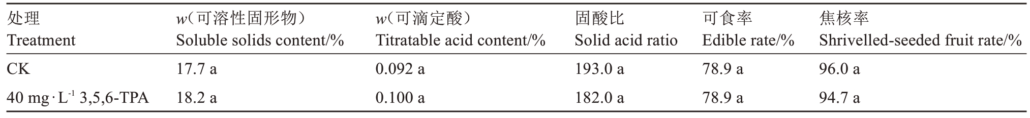 2.1.2 对果实品质影响 荔枝的可溶性固形物含量、可滴定酸含量、固酸比、可食率、焦核率等是评判荔枝品质的重要指标,在花后5 周喷施3,5,6-TPA 对荔枝果实内在品质的影响如表2 所示,所测指标均没有显著差异。