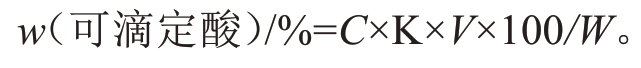 式中,C 为NaOH 溶液的浓度(mol·L-1); W 为样品体积(mL);V 为滴定时消耗NaOH 溶液的体积(mL),K为换算系数(0.067)。