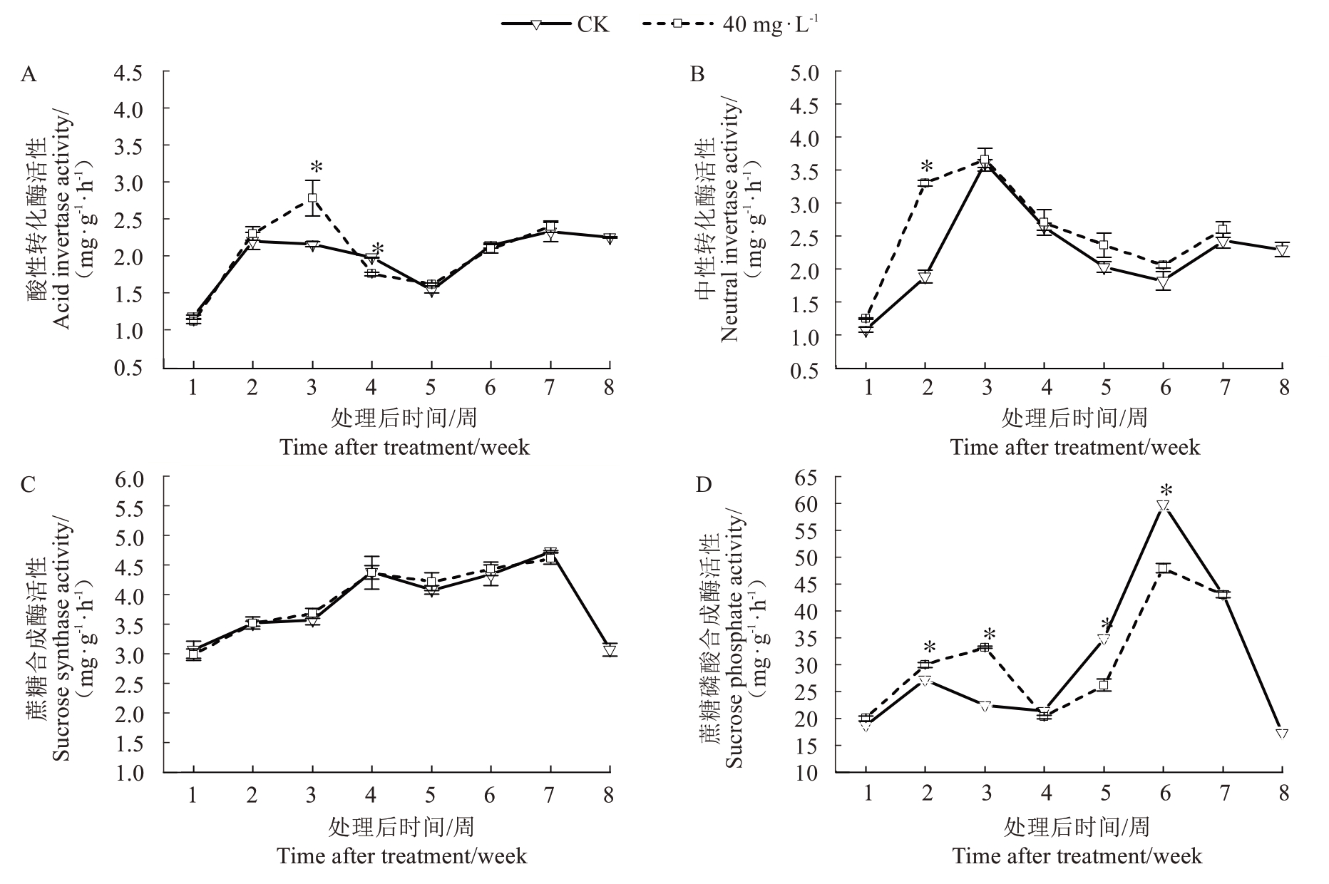 2.2.2 对果实发育过程中糖分含量和相关代谢酶活性的影响 为了分析喷施3,5,6-TPA 对仙进奉荔枝果实糖分含量的影响,测定了喷施3,5,6-TPA 后不同时期的糖组分变化,结果如图8-A 所示,在处理后第2~3 周,处理的蔗糖含量迅速上升,且上升幅度明显大于对照,到第3 周,处理的蔗糖含量达到最高,为85.1 mg·g-1,对照的蔗糖含量为55.2 mg·g-1,两者的差值最大。从第3 周开始,处理的蔗糖含量开始下降,到最后采收时含量为51.1 mg·g-1,而对照的蔗糖含量则在第4 周达到最高值,为75.5 mg·g-1,从第4周开始下降,到最后采收时的含量为44.9 mg·g-1。果糖含量从处理到最后采收时均呈上升趋势(图8-B),处理后第3周具有显著差异,处理比对照显著提高了57.3%。到最后采收时处理与对照没有显著差异,分别为39.6 mg·g-1和42.5 mg·g-1。葡萄糖含量大致呈先上升后下降再上升的变化趋势(图8-C),3,5,6-TPA 处理后1 周对照的葡萄糖含量显著高于处理。对照在前2周快速积累葡萄糖,于第2周达到最大积累量(44.9 mg·g-1),与处理无显著差异。处理后第3周,处理的葡萄糖含量最高,达到59.3 mg·g-1,比对照显著提高了109.5%,其他时期,处理和对照的葡萄糖含量差异不显著。处理和对照总糖含量的变化趋势存在差异(图8-D),在处理后第1 周,处理和对照的总糖含量分别为43.3、48.9 mg·g-1,对照的总糖含量略高于处理,但不具有显著差异。随着果实发育,总糖含量迅速积累,在处理后第3周,处理和对照总糖含量差值最大,对照的果实假种皮的总糖含量为95.7 mg·g-1,而处理的总糖含量达到163.7 mg·g-1,处理比对照显著提高了71.1%。其他时期对照和处理的总糖含量差异不显著。