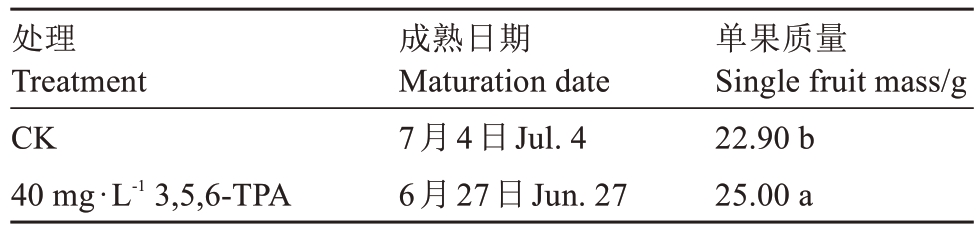 处理Treatment CK 40 mg·L-1 3,5,6-TPA单果质量Single fruit mass/g 22.90 b 25.00 a成熟日期Maturation date 7月4日Jul. 4 6月27日Jun. 27