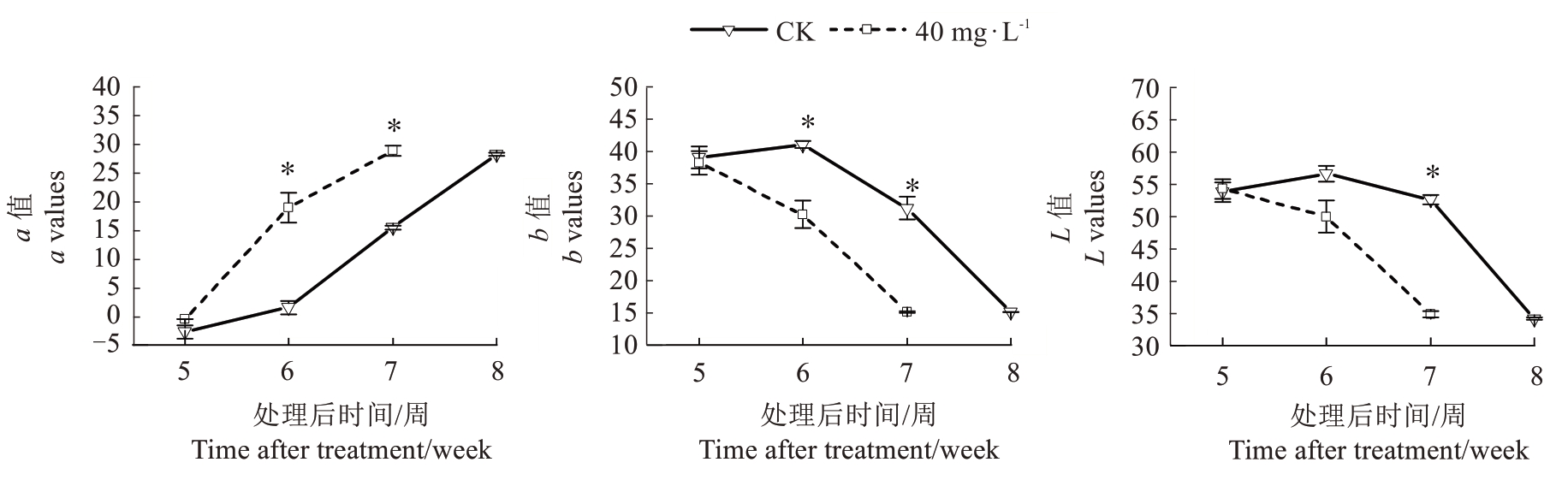 2.1.3 对果实着色的影响 花后5 周喷施3,5,6-TPA 对仙进奉果实处理后第5 周到采收期的色泽变化如图6 所示。在处理后的第5 周,处理与对照的a值不存在显著差异,在处理后的第6~7 周经过处理的果皮a 值显著高于对照。到最后采收期,对照的果皮a 值为28.3,与处理的29.0 无显著差异。以上数据说明处理的果皮颜色比对照更早转变红色,到采收期无显著差异。处理的b 值从处理后的第5 周到采收期呈现下降的趋势,而对照的b 值在处理后第5~6周呈上升趋势,在处理后第6周到采收期呈下降趋势。在处理后的第6~7周,对照的果皮b色度值显著高于处理。到最后采收期,处理与对照的果皮b 值无显著差异。处理的果皮L 值呈一直下降的趋势,直到采收期,而对照的果皮L 值在处理后第5~6周呈上升趋势,从处理后第6 周到采收期呈下降趋势。与对照相比,在处理后第7 周,处理的果皮L 值显著高于对照。在采收期,处理与对照的果皮L 值分别为34.9、34.2,二者无显著差异。以上数据说明处理的果皮亮度比对照的果皮亮度更早的下降,即果皮颜色变深更早,到采收期无显著差异。