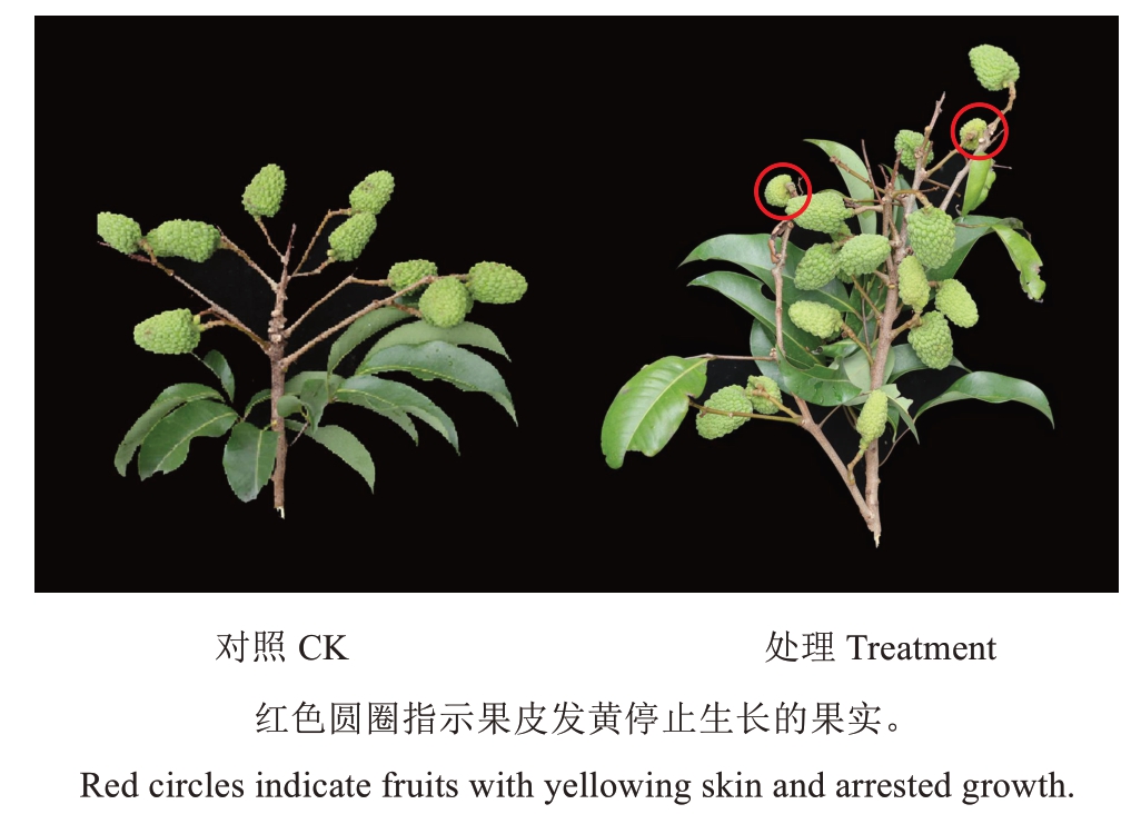 在花后5 周喷施40 mg·L-1的3,5,6-TPA 对仙进奉荔枝落果的影响如图2 所示,在处理后第1 周,处理和对照的累计落果率无显著差异,处理后第2~3周,对照的累计落果率高于处理,尤其是在第2周达到显著水平。这里需要特别指出的是,尽管处理前3 周的累计落果率低于对照组,但果穗上部分果实的发育出现果实停止生长和果皮变黄现象(图3),这些发育受阻的果实从3 周开始陆续脱落,因此导致经过3,5,6-TPA 处理的仙进奉荔枝累计落果率从第4 周开始直至采收,均高于对照,达到了一定的疏果效果。以上结果说明,花后5 周喷施40 mg·L-1 3,5,6-TPA,会造成部分幼果的发育障碍,致使果实前期落果少,后期落果多,具有一定的疏果作用。