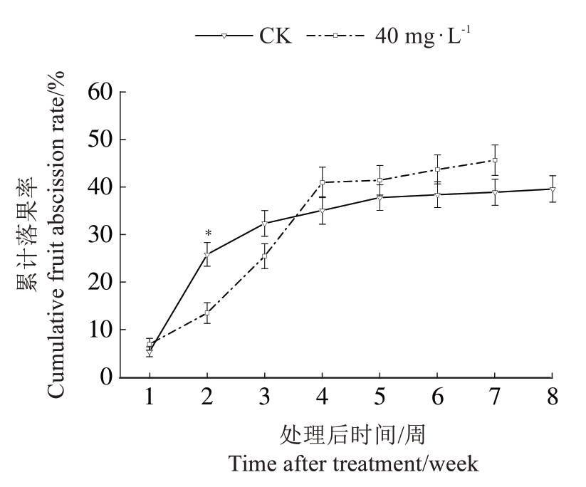 1.2.2 落果的动态分析 自喷施3,5,6-TPA 起统计初始坐果数,此后每隔1 周统计1 次落果数,直至最后采收。若存在裂果,则统计后再摘除,记录并统计分析坐果动态变化。累计落果率(cumulative abscission rate,CAR)计算公式如下:CAR/%=(X0-Xt)/X0×100。式中,X0为处理当天坐果量,Xt为t时的坐果量。
