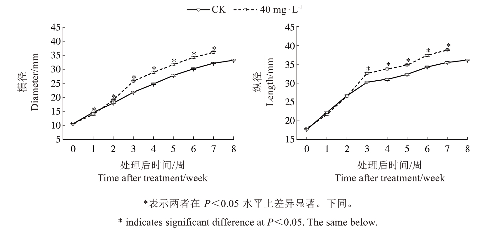 图1 花后5 周喷施3,5,6-TPA 对仙进奉果实横径和纵径发育的影响Fig. 1 Effects of 3,5,6-TPA application at 5 weeks after flowering on the transverse and longitudinal diameter development of Xianjinfeng fruit