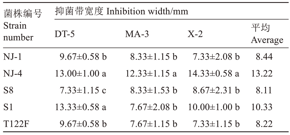 菌株编号Strain number NJ-1 NJ-4 S8 S1 T122F抑菌带宽度 Inhibition width/mm DT-5 9.67±0.58 b 13.00±1.00 a 7.33±1.15 c 13.33±0.58 a 9.67±0.58 b MA-3 8.33±1.15 b 12.33±1.15 a 8.33±1.53 b 7.67±2.08 b 7.67±1.15 b X-2 7.33±2.08 b 14.33±0.58 a 8.67±2.31 b 10.00±1.00 b 7.33±1.15 b平均Average 8.44 13.22 8.11 10.33 8.22