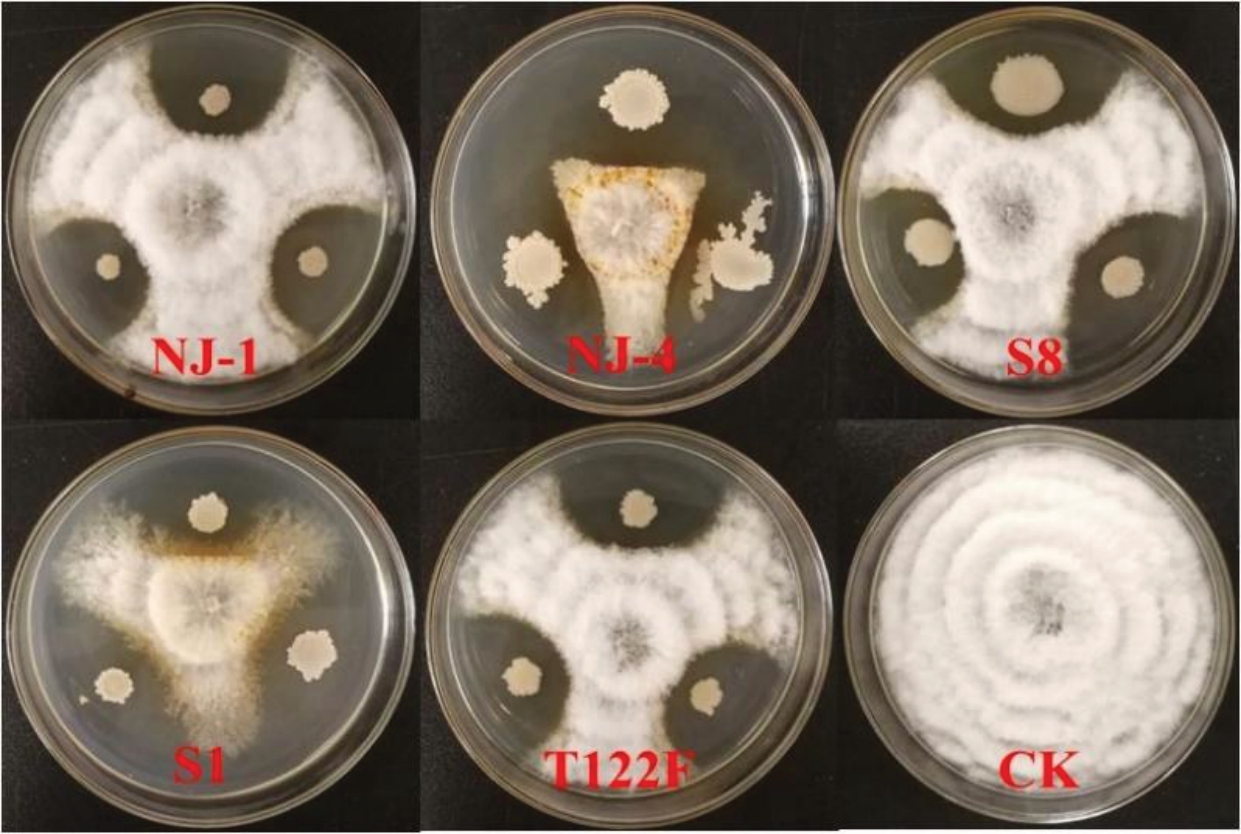 1.1.3 拮抗细菌 NJ-1和S8(解淀粉芽孢杆菌Bacillus amyloliquefaciens)、NJ-4 和S1(贝莱斯芽孢杆菌Bacillus velezensis)、T122F(枯草芽孢杆菌Bacillus subtilis)由福建省农业科学院植物保护研究所提供。