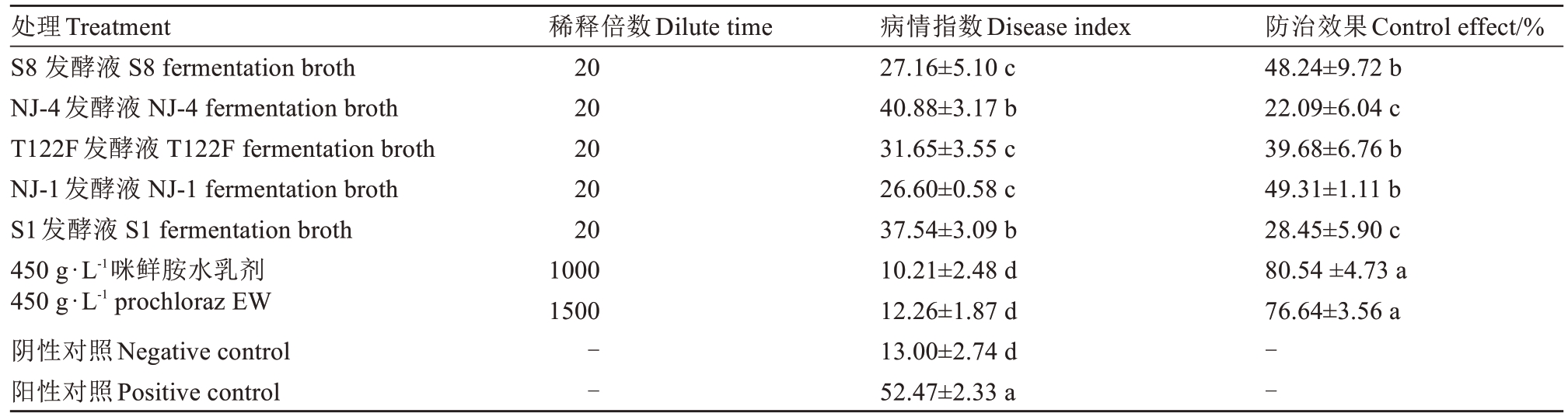 处理Treatment S8 发酵液 S8 fermentation broth NJ-4发酵液 NJ-4 fermentation broth T122F发酵液 T122F fermentation broth NJ-1发酵液 NJ-1 fermentation broth S1发酵液 S1 fermentation broth 450 g·L-1咪鲜胺水乳剂450 g·L-1 prochloraz EW阴性对照Negative control阳性对照Positive control稀释倍数Dilute time 20 20 20 20 20 1000 1500防治效果Control effect/%48.24±9.72 b 22.09±6.04 c 39.68±6.76 b 49.31±1.11 b 28.45±5.90 c 80.54 ±4.73 a 76.64±3.56 a--病情指数Disease index 27.16±5.10 c 40.88±3.17 b 31.65±3.55 c 26.60±0.58 c 37.54±3.09 b 10.21±2.48 d 12.26±1.87 d 13.00±2.74 d 52.47±2.33 a--