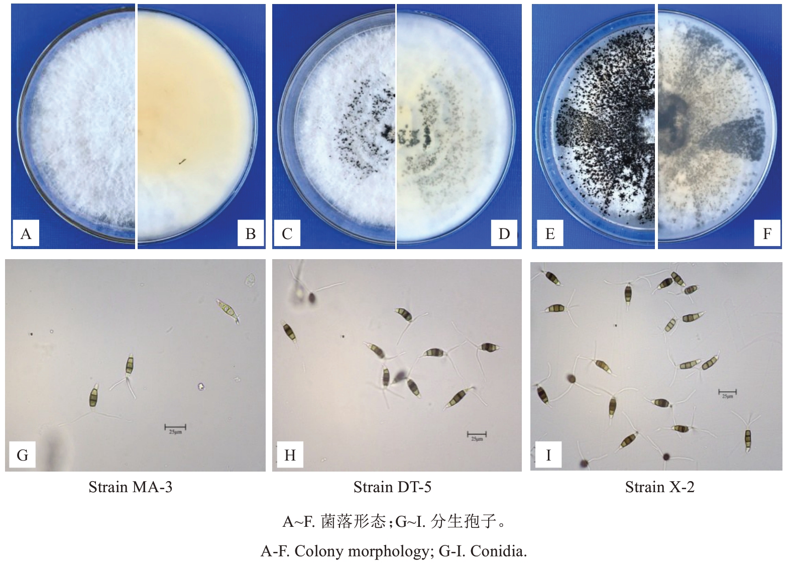 Fig. 3 Morphological characteristics of pathogenic fungus colonies and their conidia