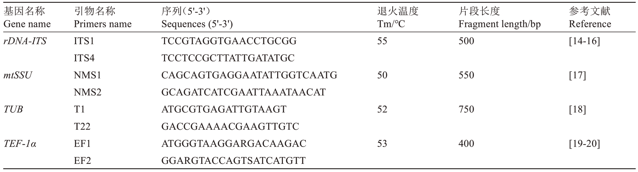 基因名称Gene name rDNA-ITS退火温度Tm/℃55片段长度Fragment length/bp 500参考文献Reference[14-16]mtSSU 50 550[17]TUB 52 750[18]TEF-1α引物名称Primers name ITS1 ITS4 NMS1 NMS2 T1 T22 EF1 EF2序列(5'-3')Sequences (5'-3')TCCGTAGGTGAACCTGCGG TCCTCCGCTTATTGATATGC CAGCAGTGAGGAATATTGGTCAATG GCAGATCATCGAATTAAATAACAT ATGCGTGAGATTGTAAGT GACCGAAAACGAAGTTGTC ATGGGTAAGGARGACAAGAC GGARGTACCAGTSATCATGTT 53 400[19-20]