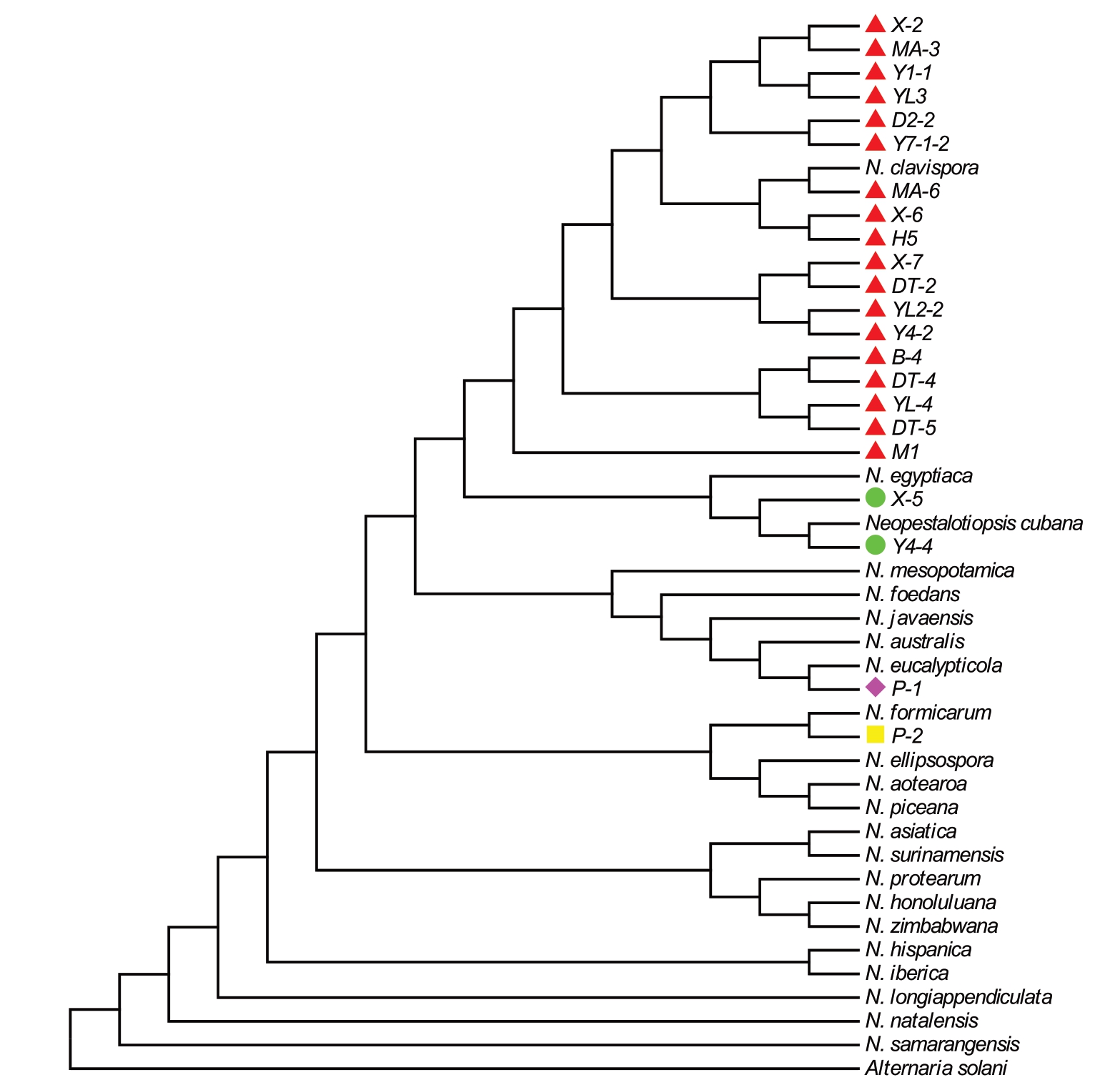 对从枇杷叶斑病样本中分离的22 株菌株,分别对其rDNA-ITS、mtSSU、TUB 和TEF-1α 基因进行PCR 扩增、测序,获得长度分别为514、432、755 和570 bp 的目的基因序列,与GenBank 中相应基因序列(No.PQ345466、No.EU119118、No.OQ168328 和No.CP068086)的相似性分别为97.66%~100.00%、97.87% ~100.00% 、97.89% ~99.98% 和98.23% ~99.97%。以番茄早疫病菌Alternariasolani 作为外群,按照rDNA-ITS、TUB、mtSSU、TEF-1α 排序构建多基因系统发育树。结果表明,菌株Y4-4与参考菌株N. cubana的进化关系较近,聚为一个独立的进化支;P-2 与参考菌株N. formicarum、P-1 与N. eucalypticola、X-2 与N. clavispora 也分别聚为一个独立的进化支,各个种之间的区分度明显。此外,采用相同的方法分析其余18个菌株的鉴定结果(图4)。由此确定了西藏墨脱地区枇杷叶斑病病原为新拟盘多毛孢菌属中的4 个种,分别为N. clavispora(棒状新拟盘多毛孢)、N. eucalypticola、N. formicarum 和N. cubana(古巴新拟盘多毛孢),其出现频率分别为81.82%、4.55%、4.55%和9.10%。其中来自西让村(X-2、X-6、X-7)、德兴村(YL2-2、YL-4、Y1-1、Y4-2、Y7-1-2、YL3、DT-2、DT-4、DT-5)、地东村(D2-2)、玛迪村(MA-3、MA-6)、背崩村(B-4)、荷扎村(H5)和米日村(M1)共18 个菌株被鉴定为N. clavispora,为优势病原菌;来自墨脱村的菌株(P-1)被鉴定为N. eucalypticola,菌株(P-2)被鉴定为N. formicarum,德兴村的菌株(Y4-4)和西让村的菌株(X-5)被鉴定为N. cubana。