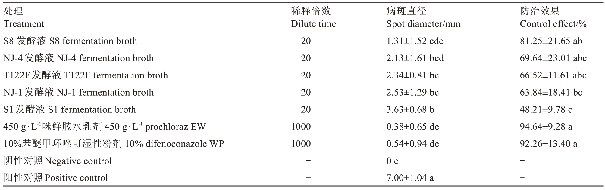 处理Treatment S8 发酵液 S8 fermentation broth NJ-4发酵液 NJ-4 fermentation broth T122F发酵液 T122F fermentation broth NJ-1发酵液 NJ-1 fermentation broth S1发酵液 S1 fermentation broth 450 g·L-1咪鲜胺水乳剂 450 g·L-1 prochloraz EW 10%苯醚甲环唑可湿性粉剂 10% difenoconazole WP阴性对照Negative control阳性对照Positive control稀释倍数Dilute time 20 20 20 20 20 1000 1000防治效果Control effect/%81.25±21.65 ab 69.64±23.01 abc 66.52±11.61 abc 63.84±18.41 bc 48.21±9.78 c 94.64±9.28 a 92.26±13.40 a--病斑直径Spot diameter/mm 1.31±1.52 cde 2.13±1.61 bcd 2.34±0.81 bc 2.53±1.29 bc 3.63±0.68 b 0.38±0.65 de 0.54±0.94 de 0 e 7.00±1.04 a--