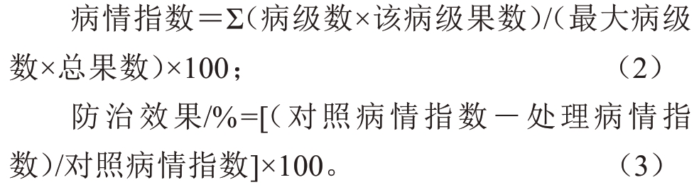 1.2.6 拮抗细菌对枇杷果斑病的防治试验 在1.2.5 基础上,试验设置:5 个拮抗细菌LB 培养液20倍稀释液处理;450 g·L-1咪鲜胺水剂1000 倍液和1500 倍液(商品推荐浓度)2 个药剂对照,以仅喷施病菌作为阳性对照和仅喷施无菌水作为阴性对照。每个处理12 个果实,3 次重复。将果实浸泡于各处理菌液或药液30 s后取出,24 h晾干后,在果实表面均匀喷施浓度为1×105个·mL-1的病菌DT-5 孢子悬浮液,喷液量约为0.2 mL。经6 h晾干后,将各处理的果实平放于塑料保鲜盒。23~25 ℃室温下存放10 d后,调查果实发病情况。依据果实病斑面积进行分级,计算病情指数(公式2)和防治效果(公式3)。病情分级标准参考文献[25],并略加修改,0级:果实无病斑;1 级:病斑面积占果实面积的5%或以下;3 级:病斑面积占果实面积的>5%~10%;5级:病斑面积占果实面积>10%~30%;7 级:病斑面积占果实面积>30%~50%;9级:病斑面积占果实面积的50%以上。