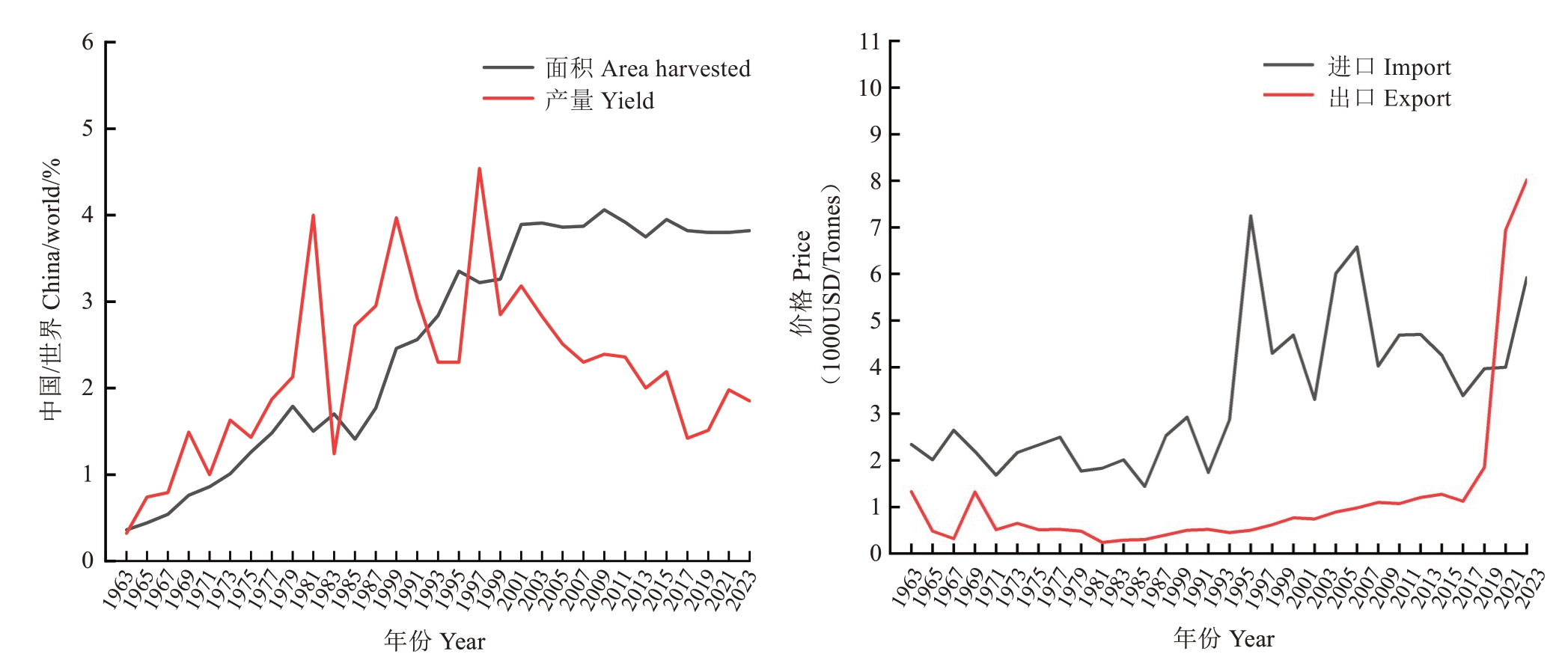 杏果消费市场受品种、质量、外观和特性等因素影响较大。根据FAO 统计数据,整理了中国1963—2023 年的杏栽培面积、产量和进出口价格(图1)。该数据呈现出中国杏产业的三个显著特征:一是中国杏栽培面积占世界杏栽培面积的比例呈持续上升,但占全球总产量的比例却在下降,单位面积产量明显低于国际平均水平。二是中国杏果产品(不包括杏干)国际贸易始于20 世纪80 年代,初期的进出口水平均较低,在2006 年进出口总量达到最高,但仅为3318 t,国际贸易规模较小。三是长期存在价格倒挂现象。除近3 年出口价格超过进口单价外,其他年份进口单价始终高于出口单价。1993—2021年期间,杏的平均进口单价是出口单价的3.45 倍。这些特征反映出中国在杏品种的改良、完善和创新等实践环节存在一些问题,如品种更新换代滞后、果实品质参差不齐和整体生产效率低下。然而,解决这些问题的前提,在于清晰、完整地了解中国杏育种研究的历史,包括杏选育品种、育种方法、育种目标等关键环节的形成和发展。因此,本文立足中国杏育种研究领域,阐述中国杏品种的选育历程、育种目标,总结不同历史时期的育种成果,分析育种工作中的成功与不足,并进一步探讨未来杏育种方向,最终实现中国杏产业从规模扩张向质量效益的转型升级,提升我国杏产业国际竞争力。