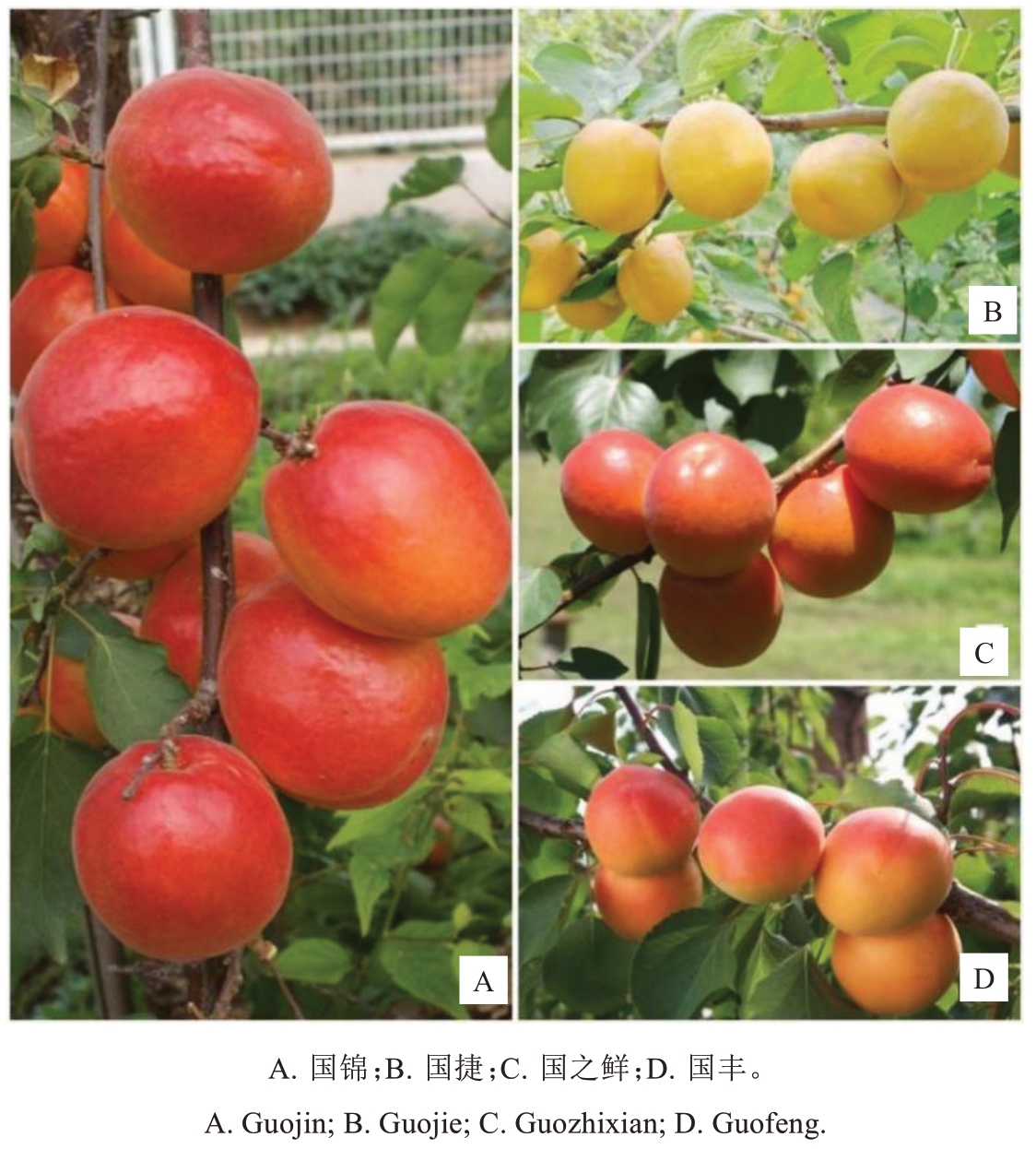 中国学者提出的新一代育种策略为解析杏果实大小、果肉硬度、可溶性固形物含量等性状的遗传规律、并研发出一套集“果树杂交种子解除休眠”“缩短实生苗童期”“果实硬度早期预测”于一体的“种子处理-实生苗培育-分子标记预选”三步高效育种技术体系。国内育种者主要开展鲜食品质育种,而忽视果实硬度、货架期等商品性好的品种选育;国外育种者主要开展商品性、高糖育种,而忽视浓香型品种选育。基于长期的产业调研与遗传背景的研究,Liu等[51]率先提出,为了弥补、克服中国地方品种果肉软、外观差、产量不稳定(即商品性差)、国外改良品种鲜食品质较差等缺点,应制定利用风味浓郁的中国地方优良品种与商品性好的国外改良品种进行组合杂交的育种策略,即‘East cross west equal to best’(简称West×East)。目前,其团队利用金太阳杏等骨干亲本,培育出国系列[52]具有自主知识产权的、商品性状显著、引领国内杏品种改良方向(图6)。