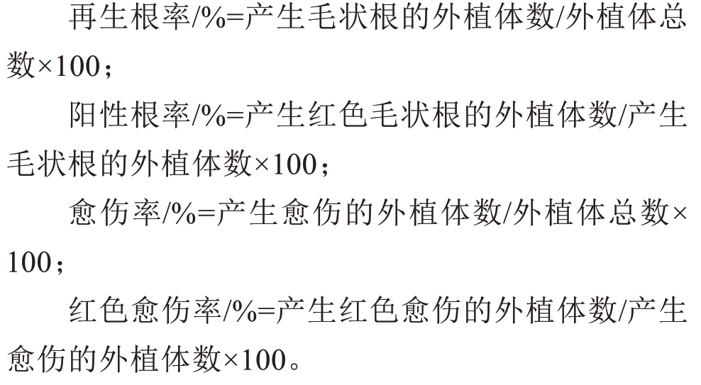 短缩茎穿刺法:挑选1 月龄无病虫害的二倍体森林草莓rg40 幼苗短缩茎,因其短缩茎部位生根能力较强,并且rg40 叶柄呈绿色,无花青素积累,可避免色素干扰,故选取此部位作为该方法的试验材料。
