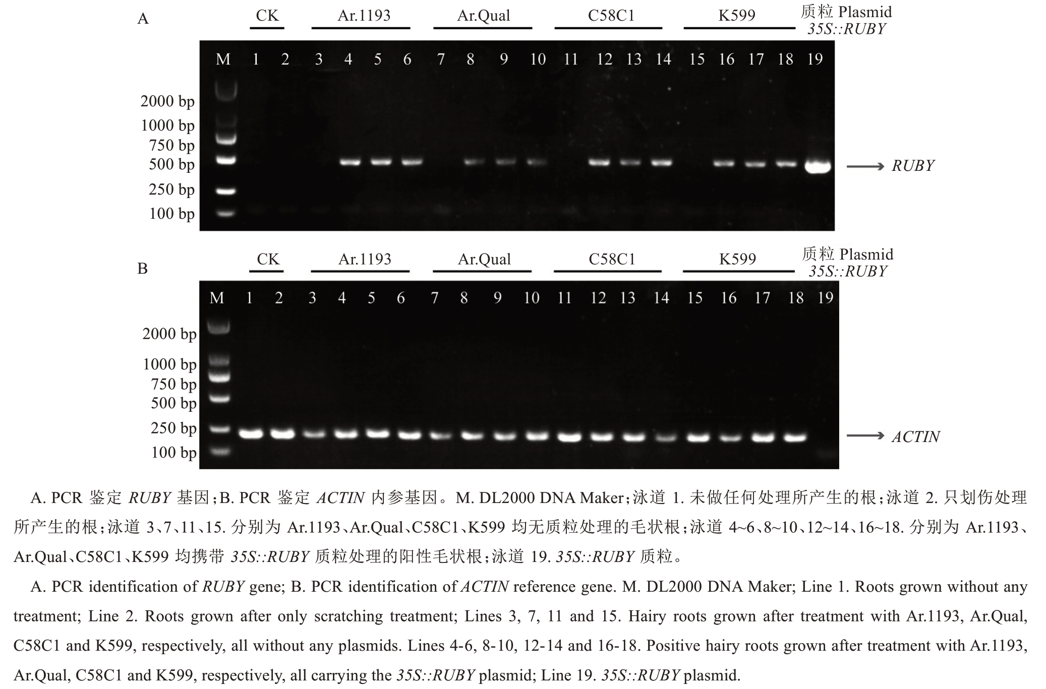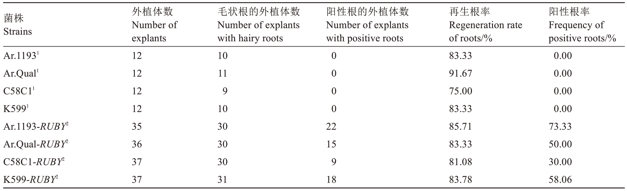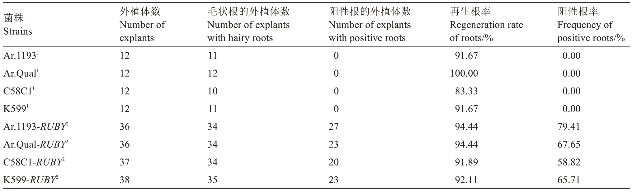 阳性根率Frequency of positive roots/%0.00 0.00 0.00 0.00 79.41 67.65 58.82 65.71菌株Strains Ar.11931 Ar.Qual1 C58C11 K5991 Ar.1193-RUBY2 Ar.Qual-RUBY2 C58C1-RUBY2 K599-RUBY2外植体数Number of explants 12 12 12 12 36 36 37 38毛状根的外植体数Number of explants with hairy roots 11 12 10 11 34 34 34 35阳性根的外植体数Number of explants with positive roots 0 0 0 0 27 23 20 23再生根率Regeneration rate of roots/%91.67 100.00 83.33 91.67 94.44 94.44 91.89 92.11