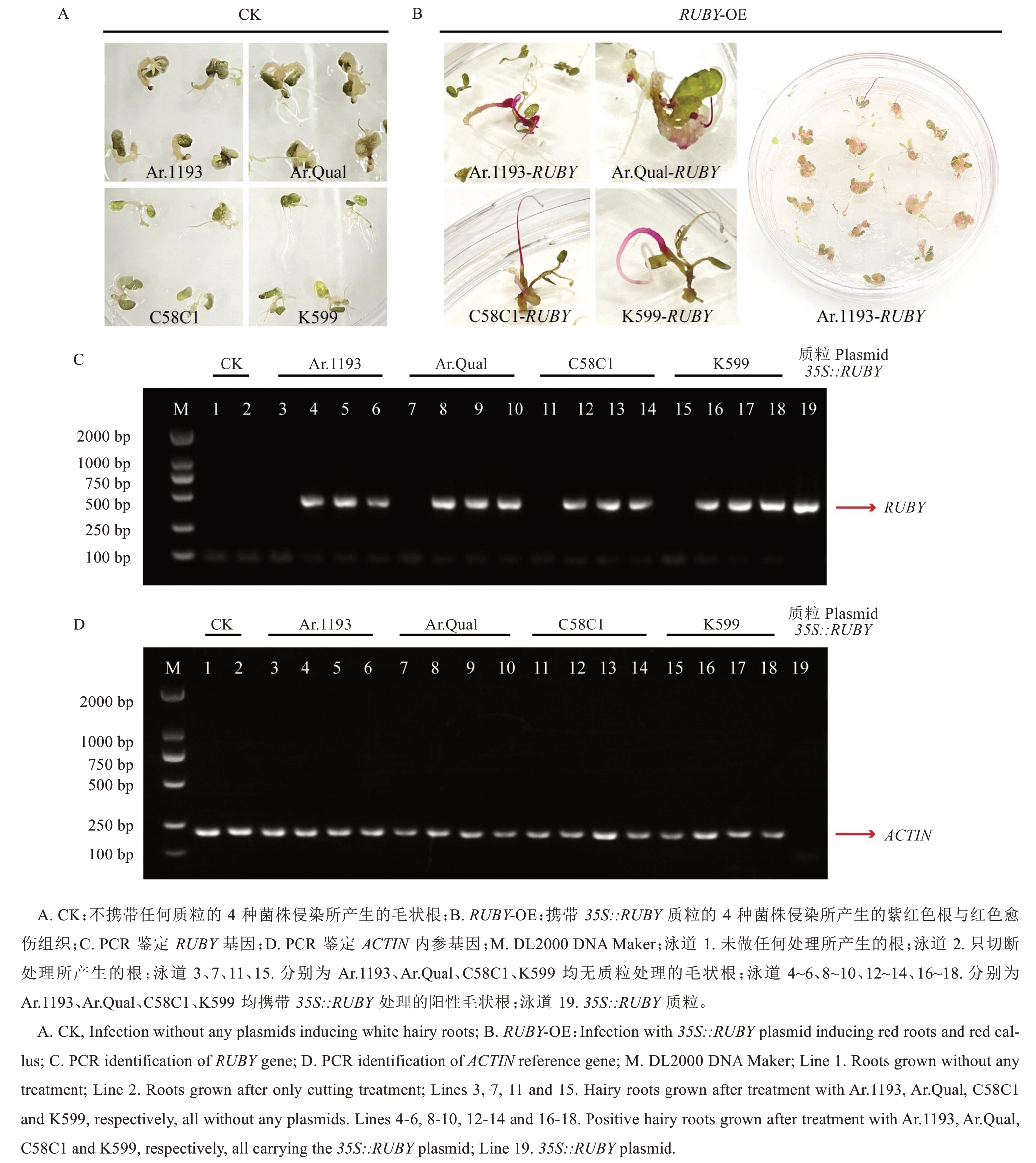 2.2.3 下胚轴侵染法愈伤及根系表型观察与鉴定以携带35S::RUBY质粒的4种菌株作为试验组(RUBY-OE),以不携带任何质粒的对应4 种菌株分别作为对照组(CK)。将带子叶的下胚轴脱菌培养(含250 mg·mL-1 Cef 的1/2 MS+2%蔗糖培养基)7~12 d时,可以观察到下胚轴伤口部位有毛状根出现。侵染30 d后进行统计,观察到对照组产生白色根(图9-A),试验组有紫红色根的产生,并且产生了红色愈伤组织(图9-B)。对获得的根进行随机取样并提取DNA,PCR 结果表明,对照组的白色根均未扩增出RUBY条带,而试验组所取紫红色根均可扩增出RUBY条带,并且条带大小正确(图9-C)。此外,紫红色根中草莓内参基因ACTIN 均存在(图9-D),进一步在DNA水平确认紫红色根为转基因阳性根。