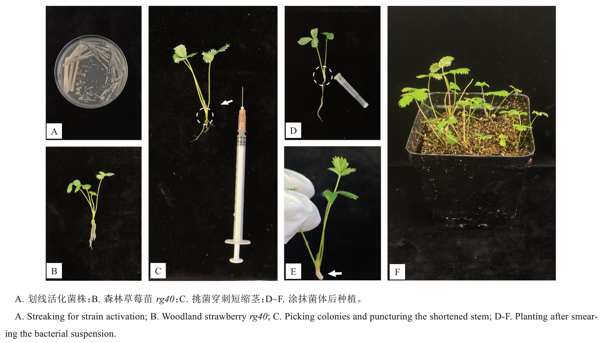 2.1.2 短缩茎穿刺法转化流程 将含有35S::RUBY的农杆菌在YEP固体培养基上划线、28 ℃恒温培养箱中培养2~3 d(图2-A)。选取1 月龄森林草莓苗rg40 作为试验材料(图2-B),用注射器针头挑取平板上的单克隆,对准幼苗短缩茎部位进行4~6 次垂直穿刺(图2-C,箭头标注为短缩茎部位),用注射器针管盖刮取平板上的菌体,均匀涂抹至短缩茎创伤部位,随后将幼苗种植于基质中(图2-D~F,箭头标注为短缩茎部位)。鉴于二倍体幼苗幼嫩易损,为避免早期取样损伤,定于45 d后进行统一观察。