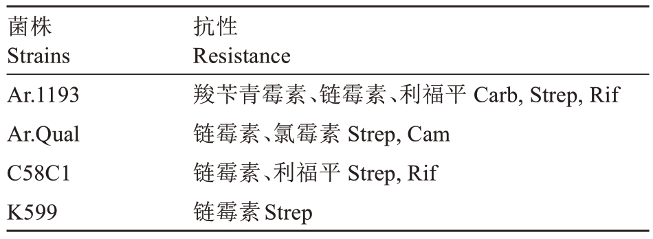 菌株Strains Ar.1193 Ar.Qual C58C1 K599抗性Resistance羧苄青霉素、链霉素、利福平 Carb, Strep, Rif链霉素、氯霉素 Strep, Cam链霉素、利福平 Strep, Rif链霉素Strep