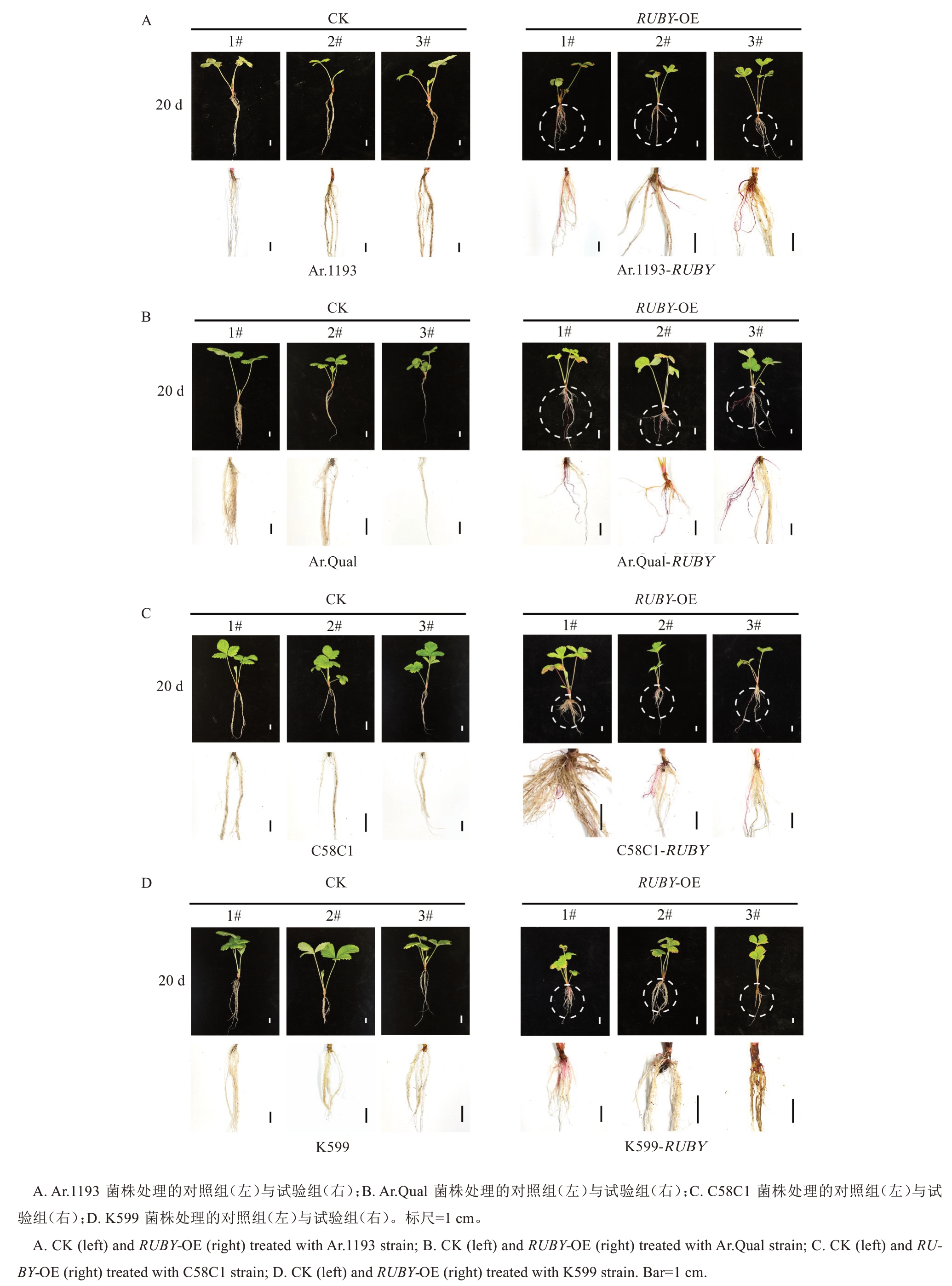 阳性根率Frequency of positive roots/%0.00 0.00 0.00 0.00 73.33 50.00 30.00 58.06菌株Strains Ar.11931 Ar.Qual1 C58C11 K5991 Ar.1193-RUBY2 Ar.Qual-RUBY2 C58C1-RUBY2 K599-RUBY2外植体数Number of explants 12 12 12 12 35 36 37 37毛状根的外植体数Number of explants with hairy roots 10 11 9 10 30 30 30 31阳性根的外植体数Number of explants with positive roots 0 0 0 0 22 15 9 18再生根率Regeneration rate of roots/%83.33 91.67 75.00 83.33 85.71 83.33 81.08 83.78