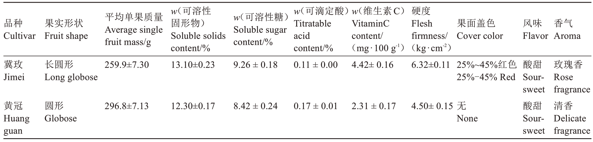 品种Cultivar果实形状Fruit shape果面盖色Cover color风味Flavor香气Aroma冀玫Jimei长圆形Long globose平均单果质量Average single fruit mass/g 259.9±7.30 w(可溶性固形物)Soluble solids content/%13.10±0.23 w(可溶性糖)Soluble sugar content/%9.26 ± 0.18 w(可滴定酸)Titratable acid content/%0.11 ± 0.00 w(维生素C)VitaminC content/(mg·100 g-1)4.42± 0.16硬度Flesh firmness/(kg·cm-2)6.32±0.11 25%~45%红色25%-45% Red黄冠Huang guan圆形Globose 296.8±7.13 12.30±0.17 8.42 ± 0.24 0.17 ± 0.01 2.31 ± 0.17 4.50± 0.15无None酸甜Soursweet酸甜Soursweet玫瑰香Rose fragrance清香Delicate fragrance