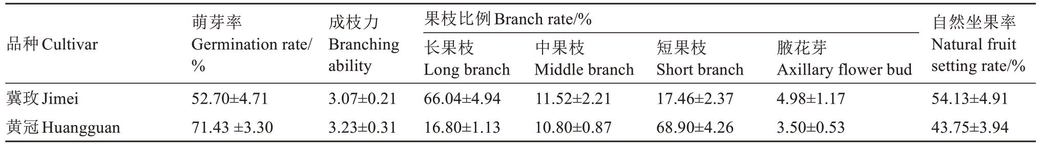 品种Cultivar冀玫Jimei黄冠Huangguan萌芽率Germination rate/%52.70±4.71 71.43 ±3.30成枝力Branching ability 3.07±0.21 3.23±0.31果枝比例Branch rate/%长果枝Long branch 66.04±4.94 16.80±1.13中果枝Middle branch 11.52±2.21 10.80±0.87短果枝Short branch 17.46±2.37 68.90±4.26腋花芽Axillary flower bud 4.98±1.17 3.50±0.53自然坐果率Natural fruit setting rate/%54.13±4.91 43.75±3.94