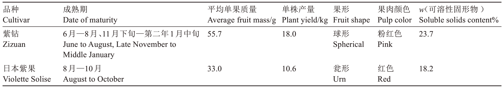 品种Cultivar紫钻Zizuan平均单果质量Average fruit mass/g 55.7单株产量Plant yield/kg 18.0果形Fruit shape球形Spherical果肉颜色Pulp color粉红色Pink w(可溶性固形物)Soluble solids content%23.7日本紫果Violette Solise成熟期Date of maturity 6月—8月、11月下旬—第二年1月中旬June to August, Late November to Middle January 8月—10月August to October 33.0 10.6瓮形Urn红色Red 18.2